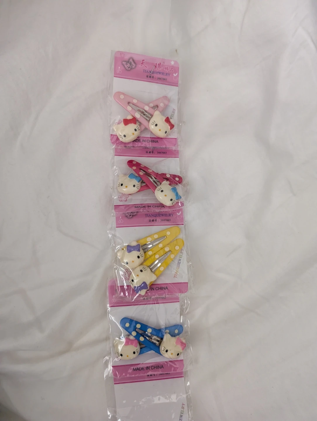 I have some adorable Hello Kitty hair clips still in their original packaging! They come in a variety of colors and are perfect for kids or anyone who loves Hello Kitty.