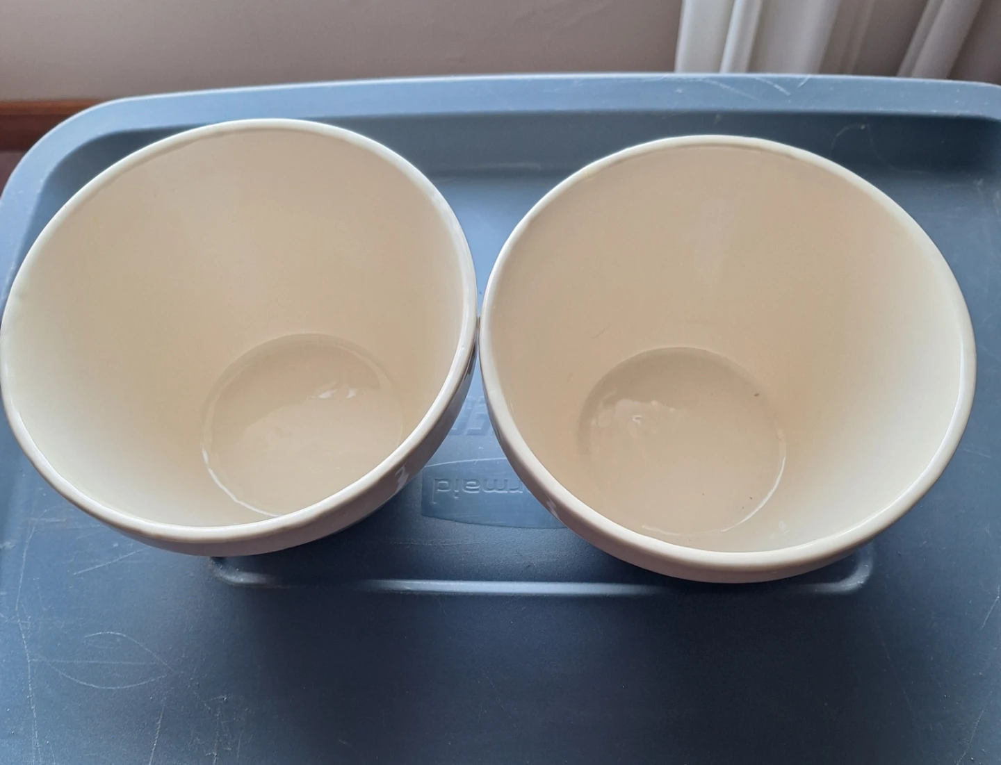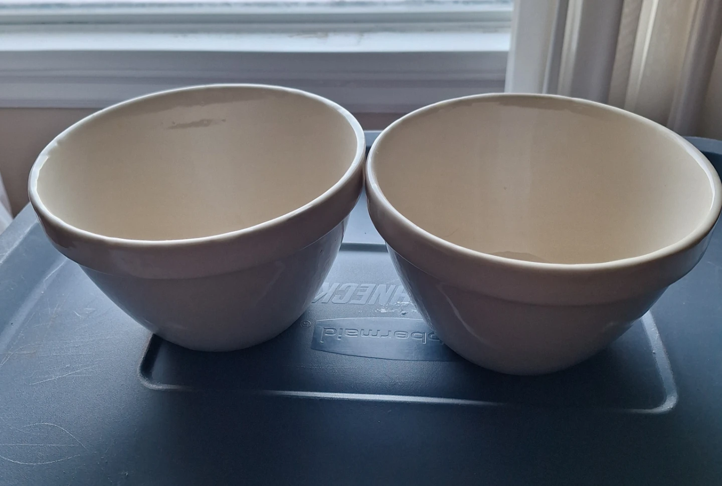 Two Vintage Heavy Stoneware Mixing/Pudding Bowls. Measures 6.5 " W x 4.5" H. Capacity approximately 4 cups. No chips or cracks. Made in England. Pickup Scarborough Pharmacy and Ellesmere. Courtice area can be arranged.