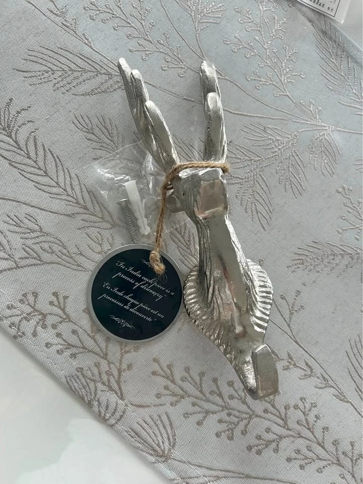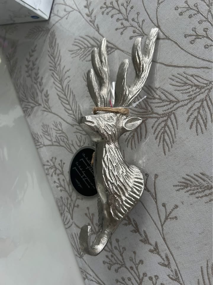 Add a touch of rustic charm to your home with this silver reindeer wall hook! It's perfect for hanging coats, hats, or even just as a decorative piece. It is brand new and still has the tag attached. It is made of durable material and is sure to last for years to come.