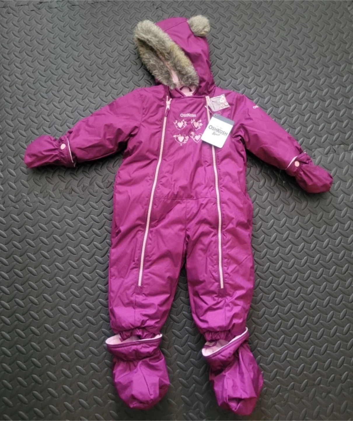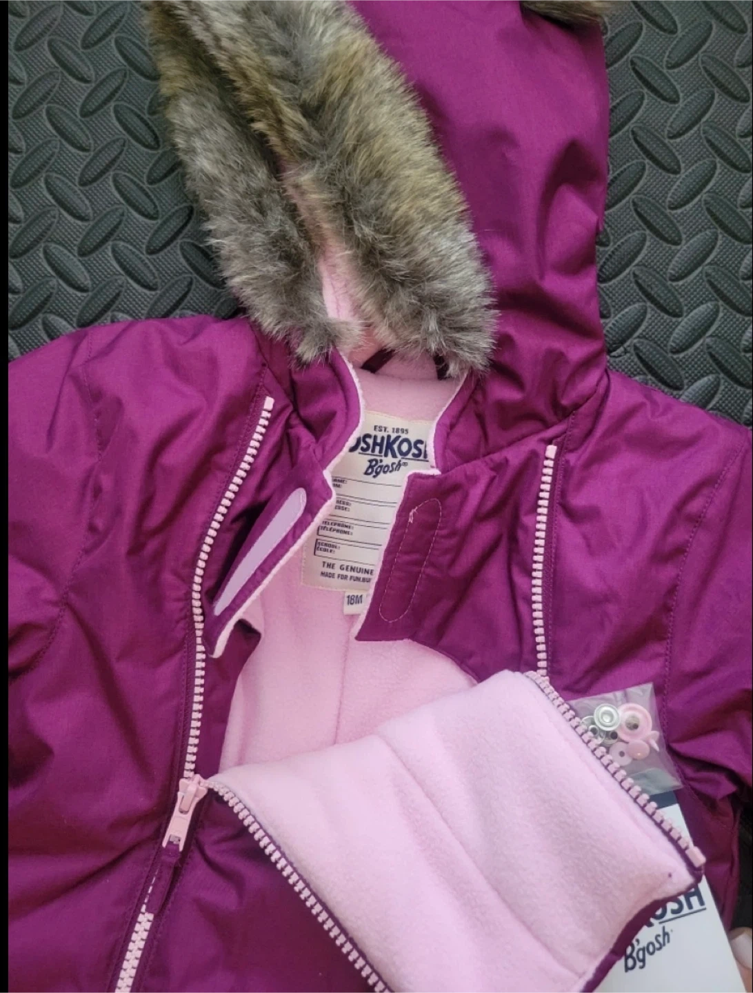 Check out this adorable OshKosh Bgosh snowsuit in size 18M! It's a lovely purple colour and has a cozy hood with faux fur trim. Perfect for keeping your little one warm and snug during the winter months. It's in great condition and ready for some snowy adventures!