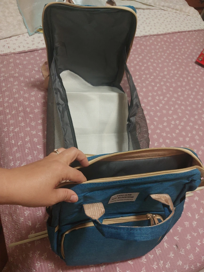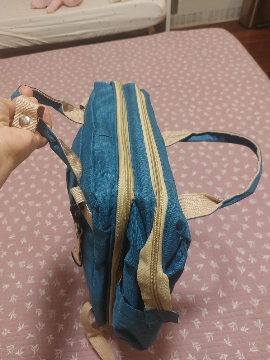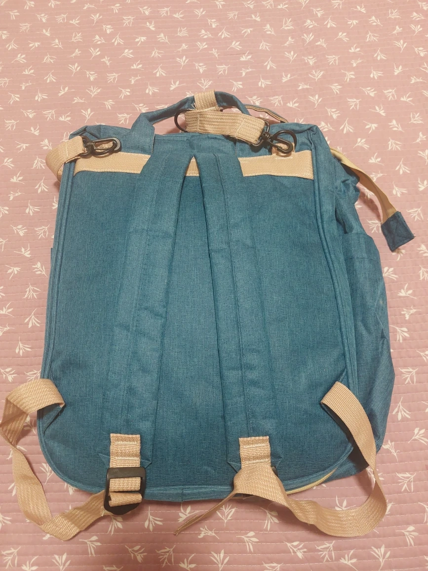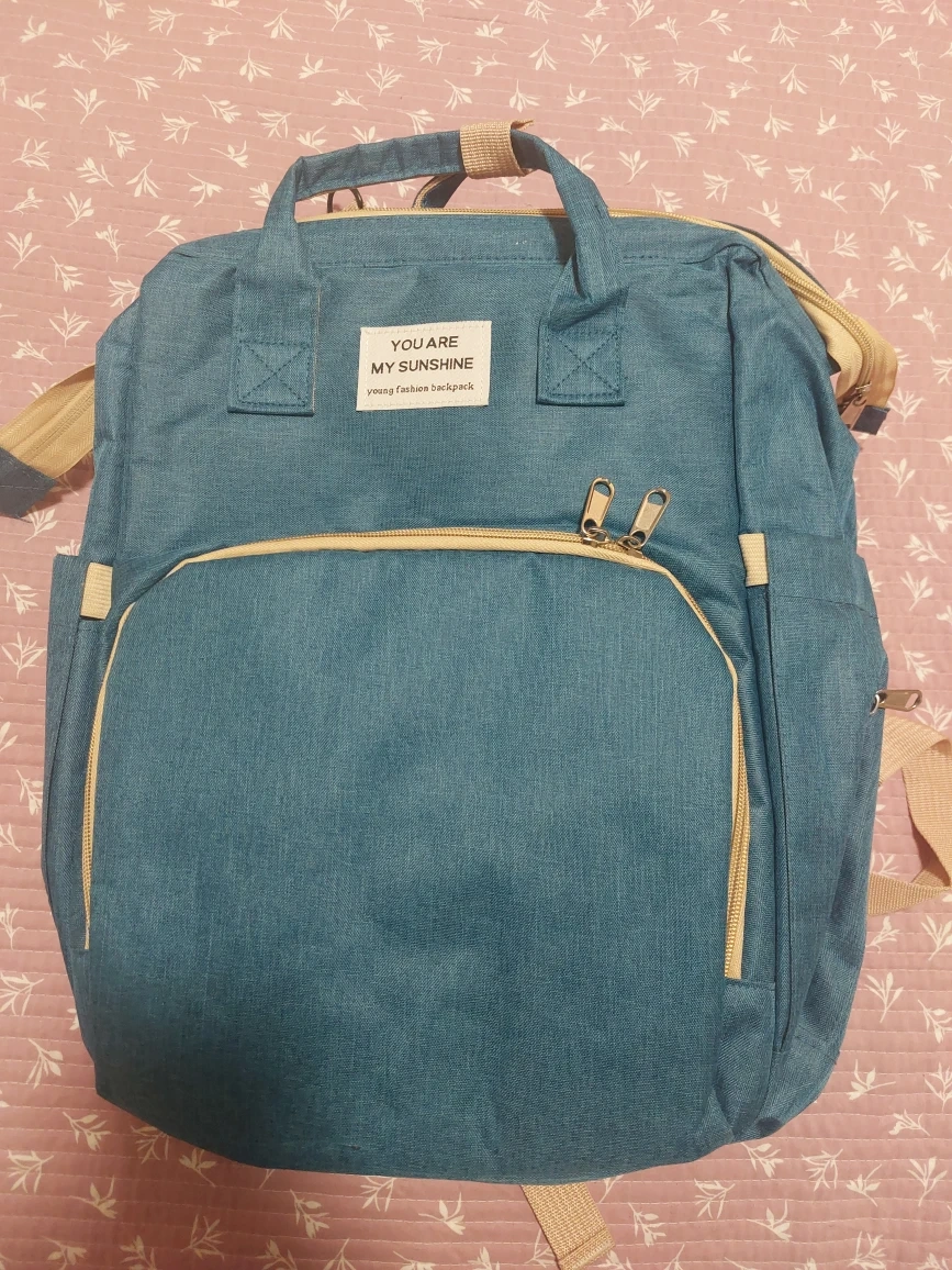 Here's a diaper bag backpack in a nice blue colour. It has a good amount of storage space and several compartments to keep things organized. Perfect for parents on the go! This expands into a changing mat or space for baby to nap!