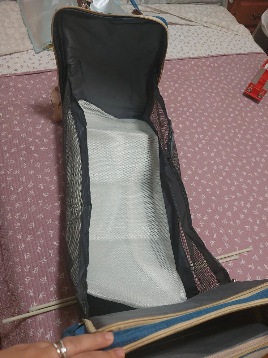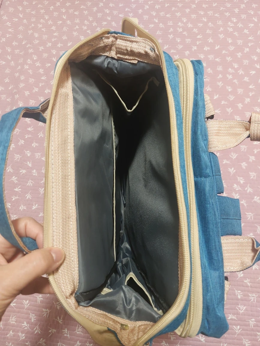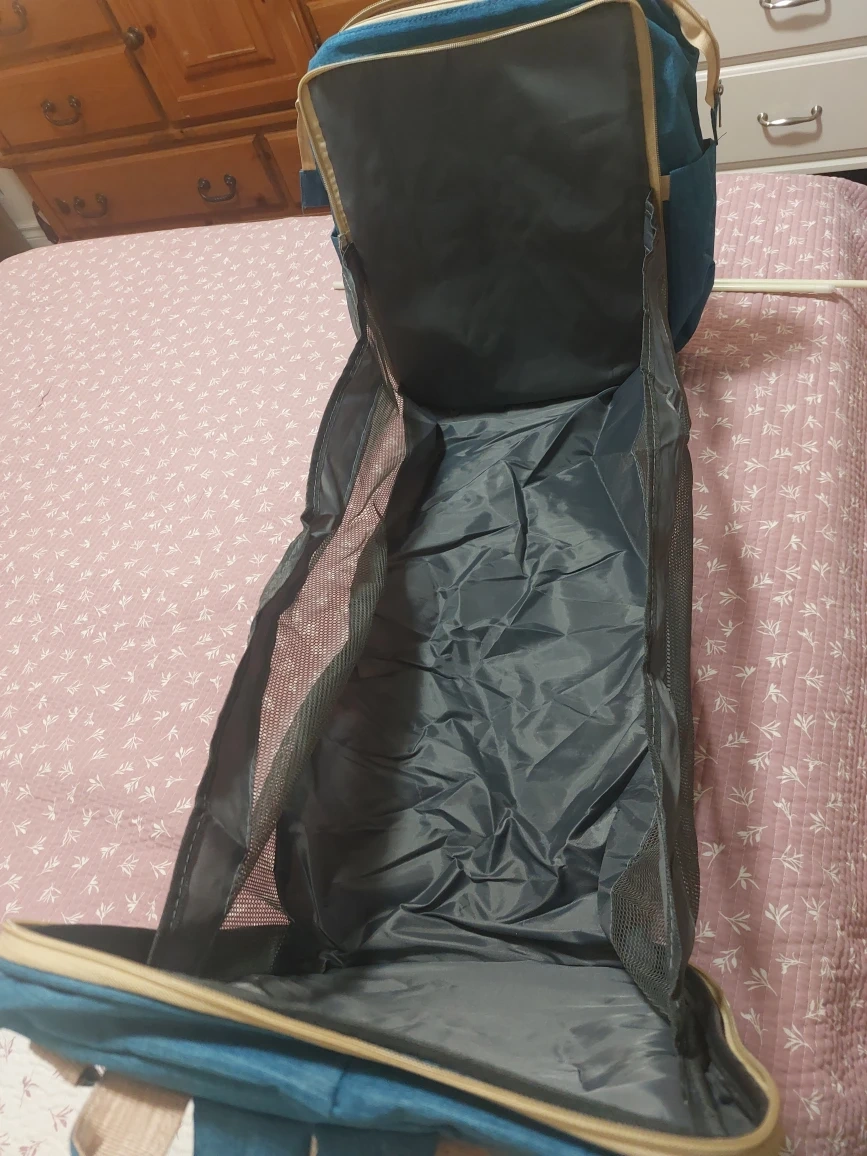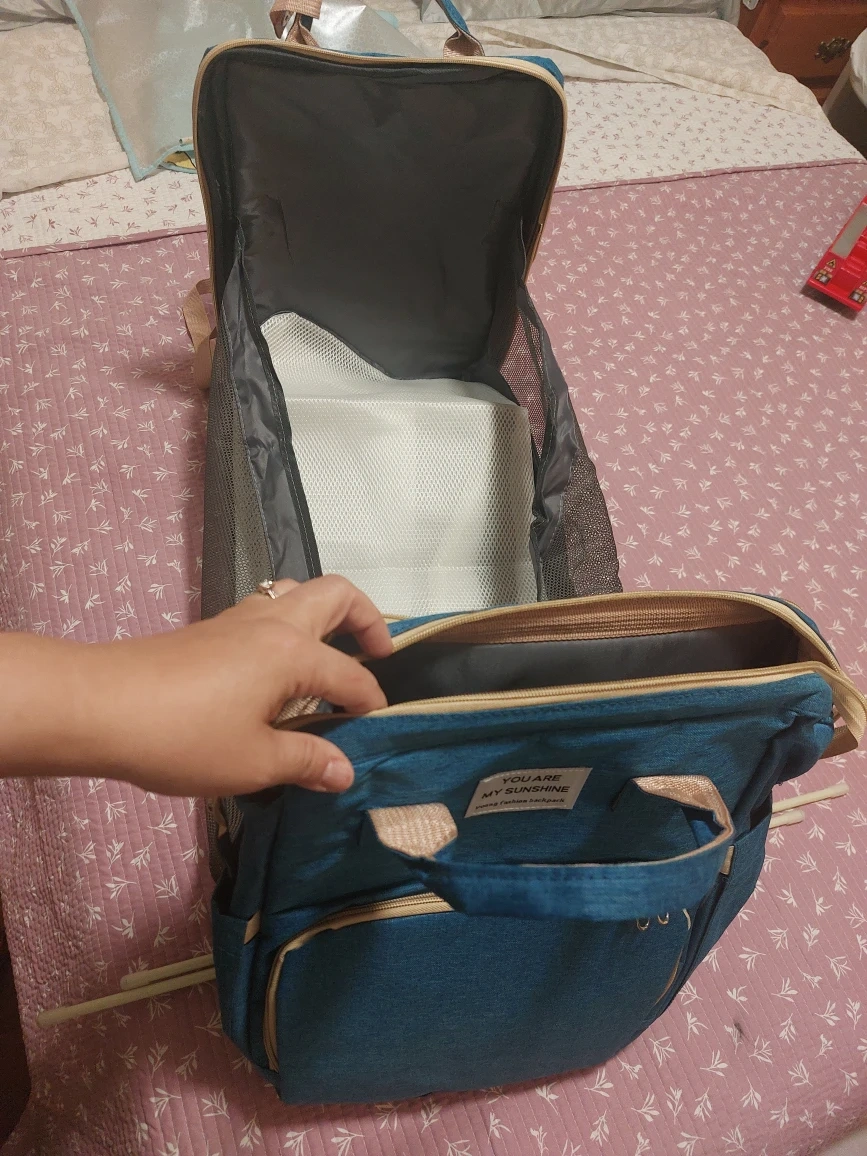 Here's a diaper bag backpack in a nice blue colour. It has a good amount of storage space and several compartments to keep things organized. Perfect for parents on the go! This expands into a changing mat or space for baby to nap!