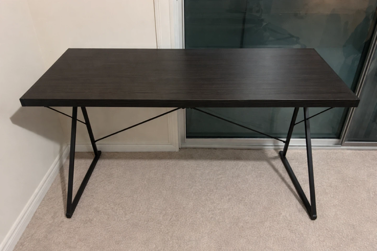 Selling a modern black office/study table in very good condition. Clean, minimal design that fits perfectly in a home office, bedroom, or study space. The table has a strong metal frame with a smooth dark wood –finish top, making it sturdy and durable for daily use.