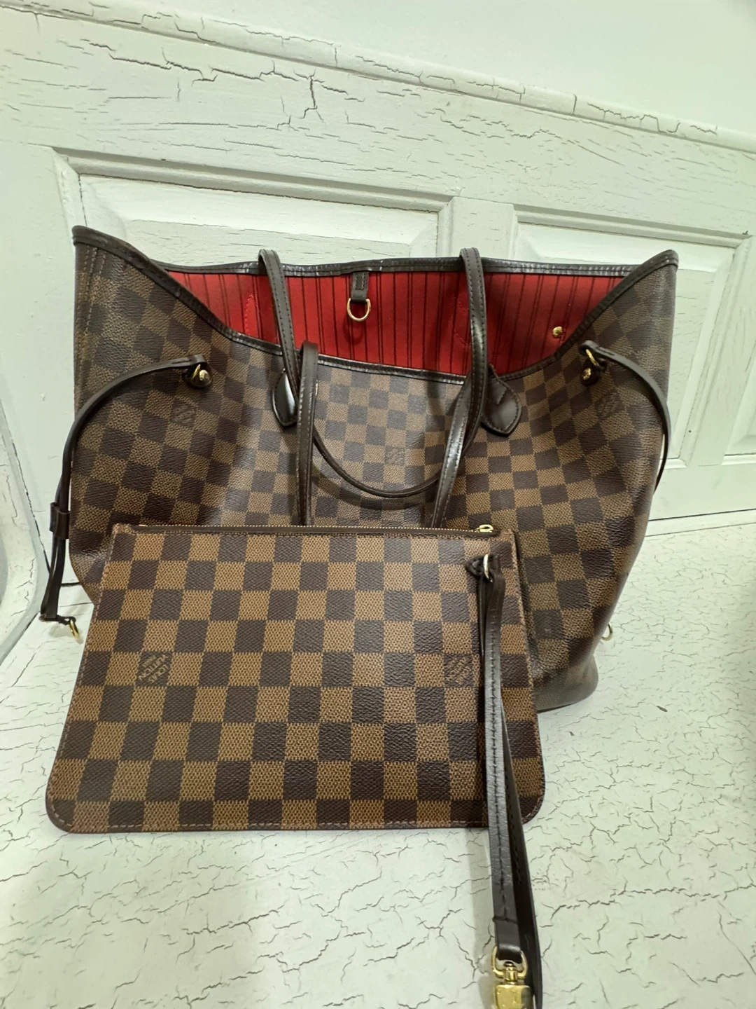 Selling a Louis Vuitton Neverfull MM in Damier Ebene canvas. It comes with a matching pouch! The interior lining is a beautiful red colour. It's a stylish and practical tote for everyday use.