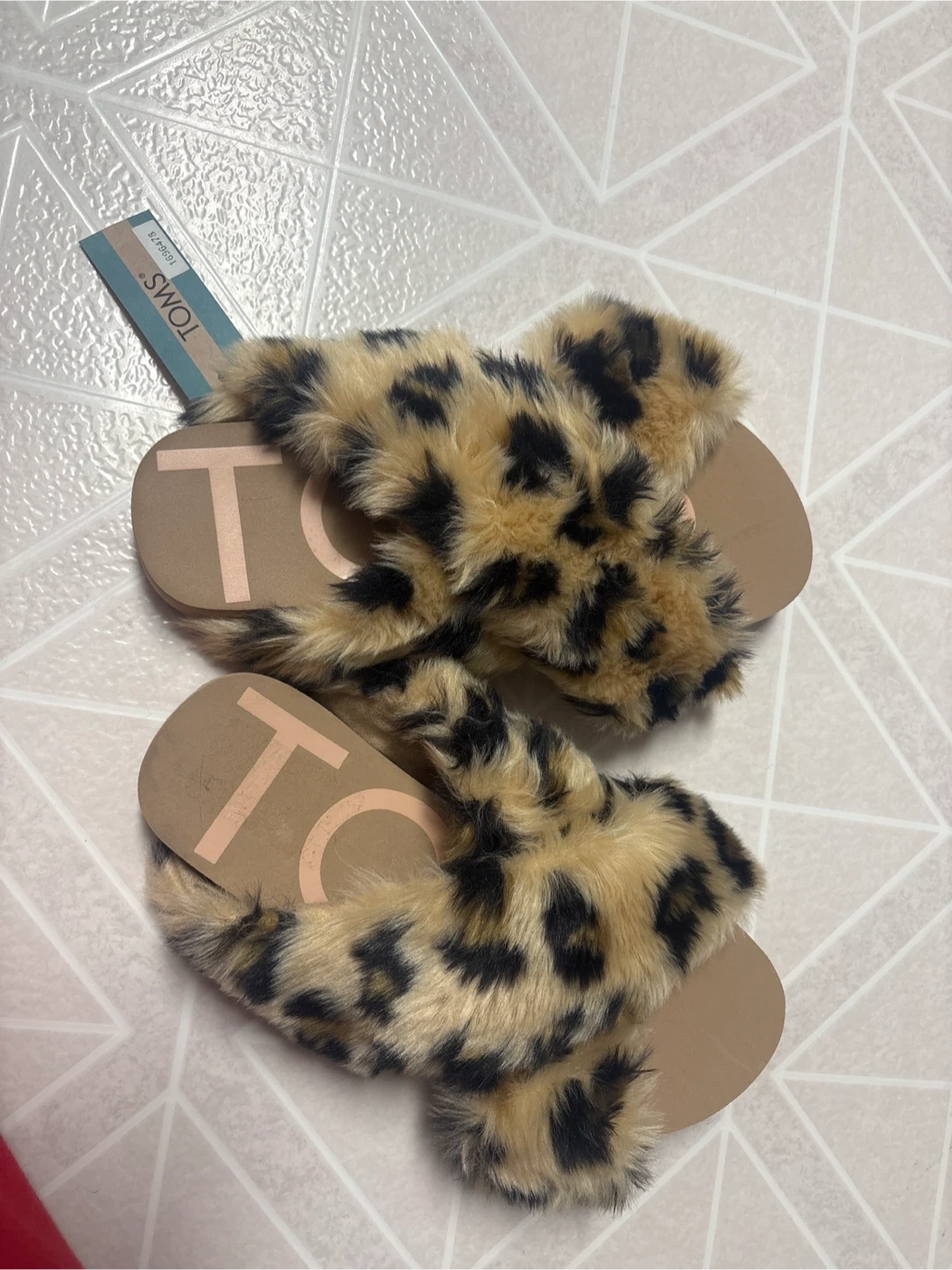 Cute and comfy TOMS slides with a fun leopard print faux fur design! They're in great shape and ready for a new owner. Perfect for adding a touch of style to your loungewear or casual outfits size 9 pick up cash only