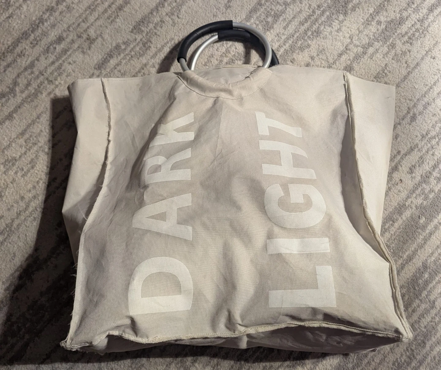 Laundry bag with 'DARK' and 'LIGHT' printed on the sides. It has two compartments inside to separate your clothes. Perfect for keeping your laundry organized!