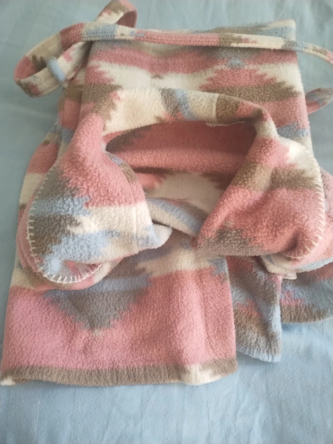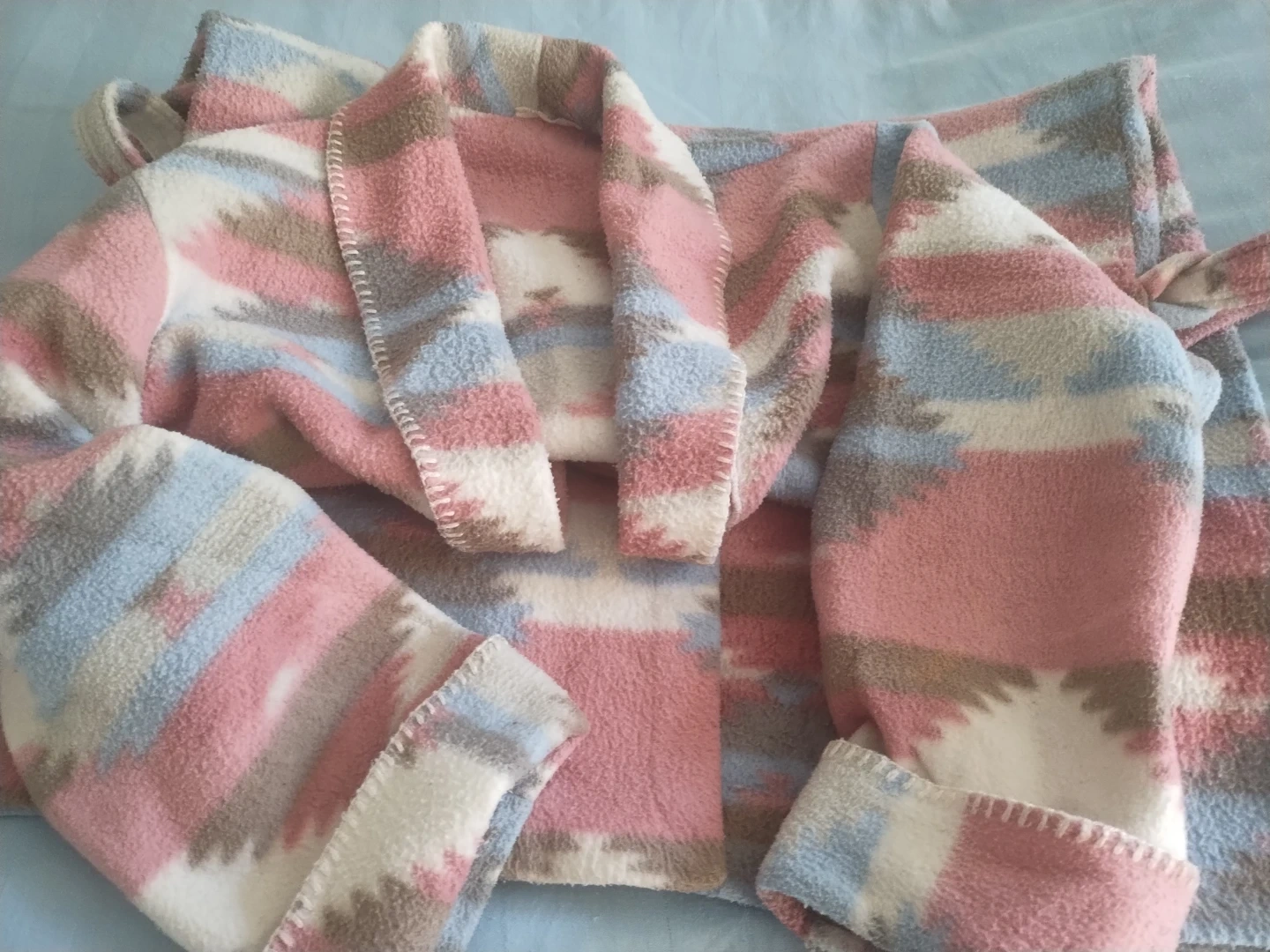 Cozy fleece robe with a unique pink, blue, and white pattern. Perfect for lounging around the house on chilly days!