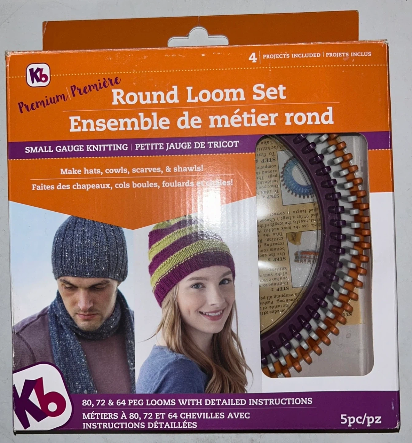 Makes hats, scarves, shawls 80, 72, & 64 peg looms