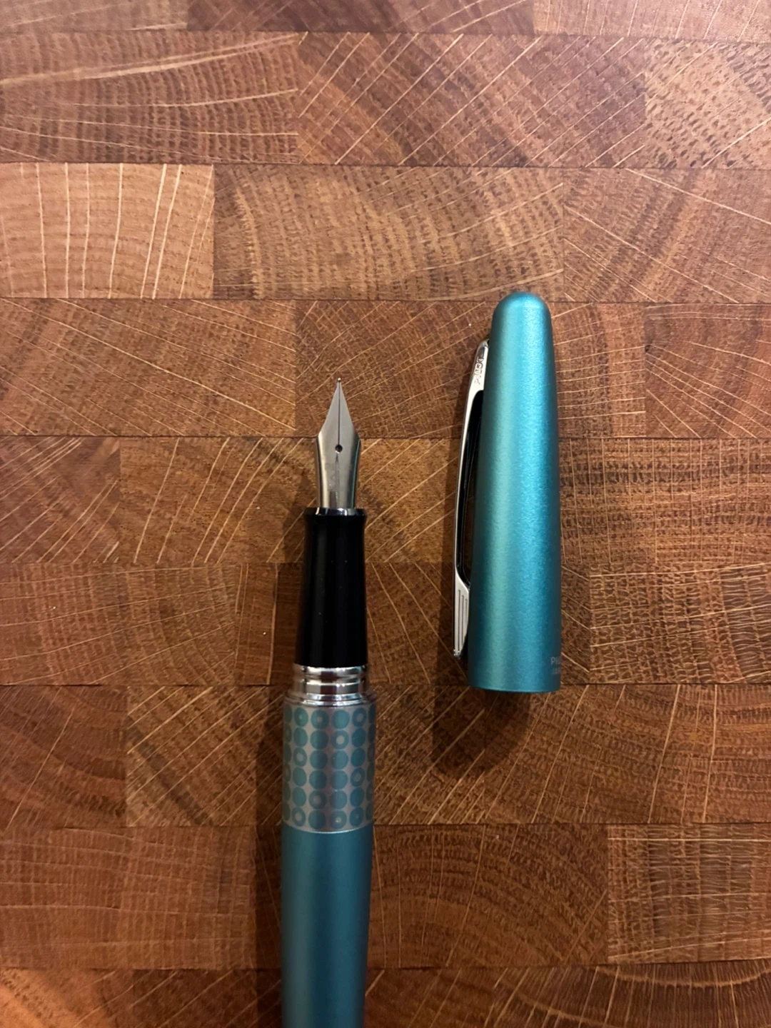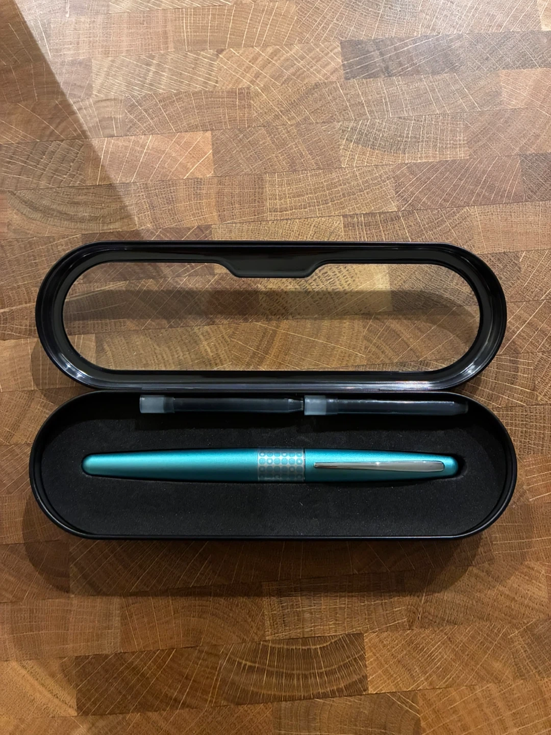 Selling a pilot metropolitan fountain pen in retro pop turquoise in great condition. It's a metal bodied pen sporting a fine nib with no dents or scratches. Comes with the included CON-B converter and two pilot black cartridges. Perfect for the fountain pen beginner or collector. Original packaging included.
