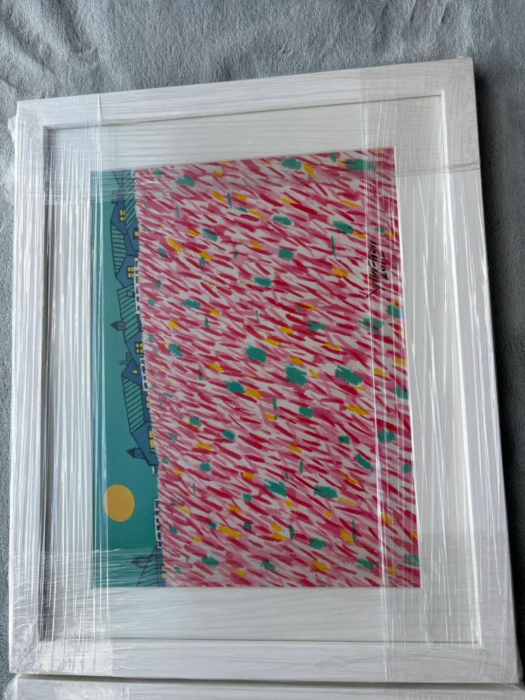Selling a piece of framed wall art! It's brand new and safely wrapped. Ready to add a pop of colour to your space. The frame is white and the art features a unique design.
