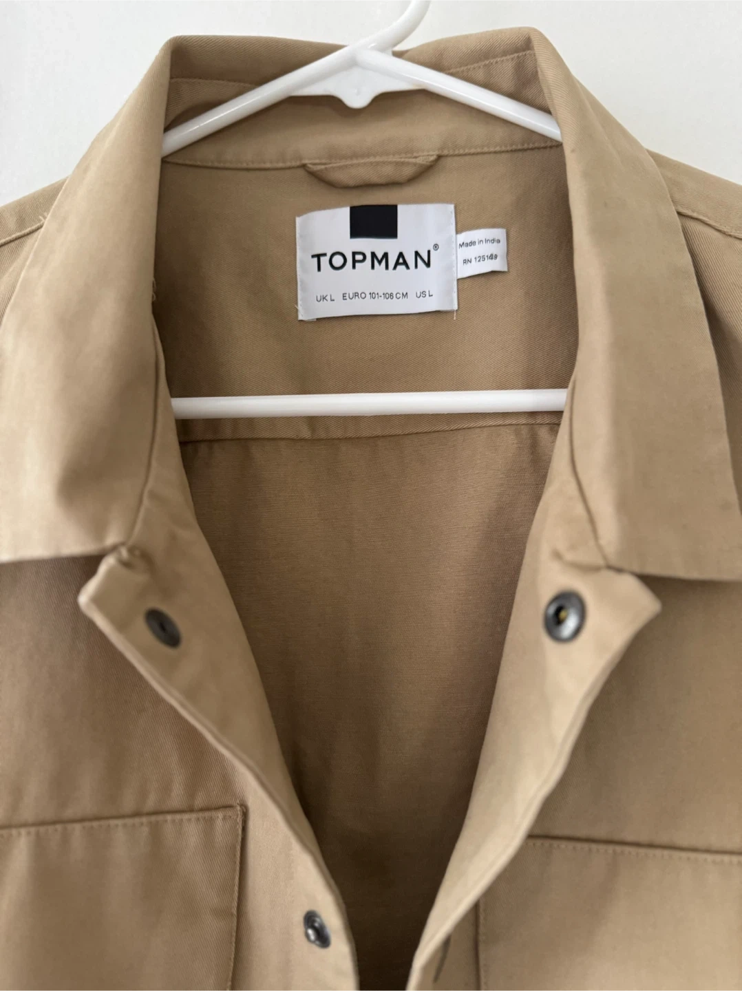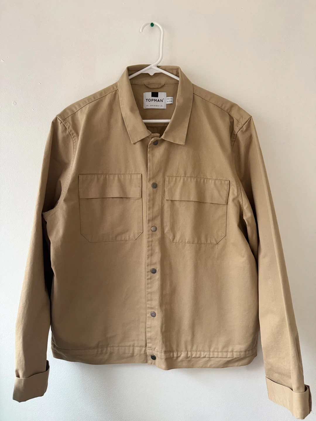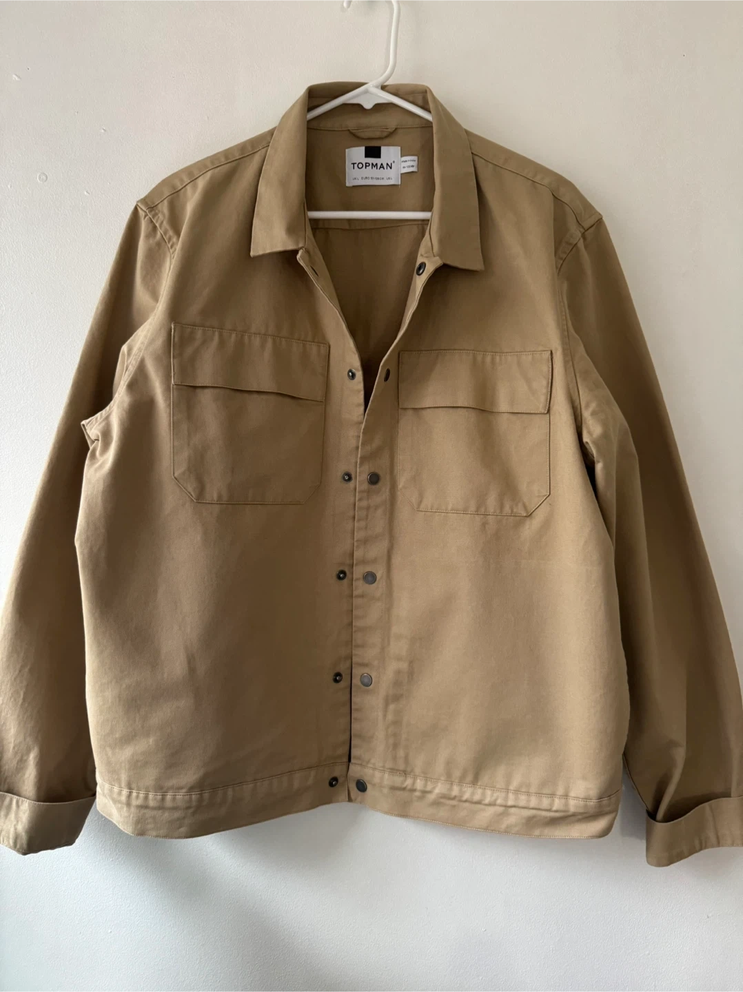 Here's a Topman jacket in size L! It's a beige colour and in great condition. Perfect for layering or wearing on its own