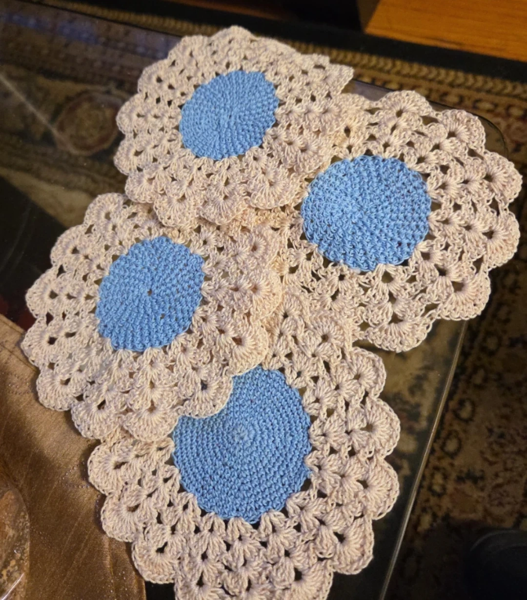 Selling a set of four handmade crochet coasters. They feature a lovely cream colour with a blue centre. Perfect for adding a touch of handmade charm to your home!