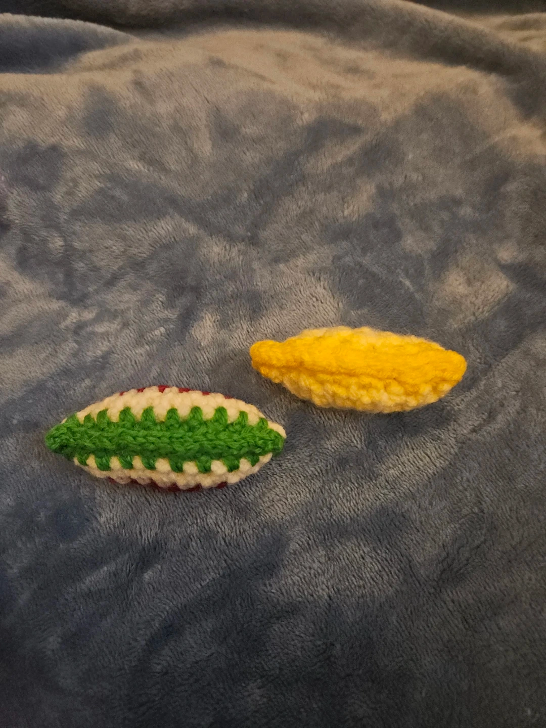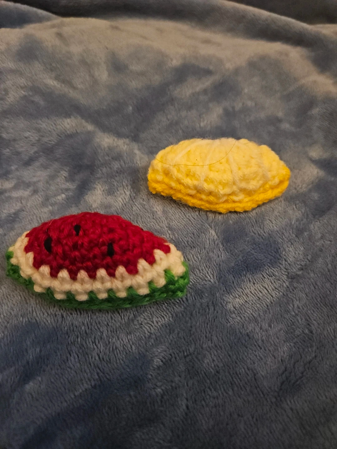 Cute handmade crochet plushies. One is a slice of watermelon with red, green, and white detailing, and the other is a bright yellow lemon slice. Perfect for adding a touch of fun to any bag. ☆Also I do take requests or other fruits key chains just ask☆