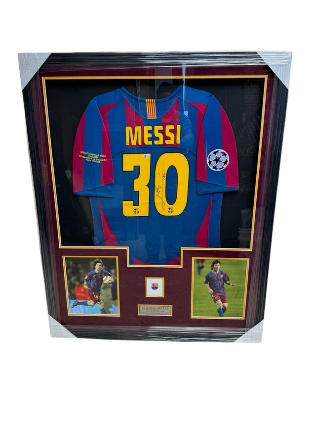 Own a piece of soccer history with this framed, signed Lionel Messi jersey, a tribute to one of the greatest players of all time. This striking display captures the essence of Messi's legacy and is an ideal collectible for soccer enthusiasts. This is a used item.