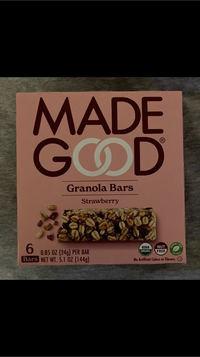 Giving away a brand new box of MadeGood Strawberry Granola Bars! Each box contains 6 bars, with each bar weighing 0.85 oz (24g). The best before date is 2026 March 04, the box is unopened.