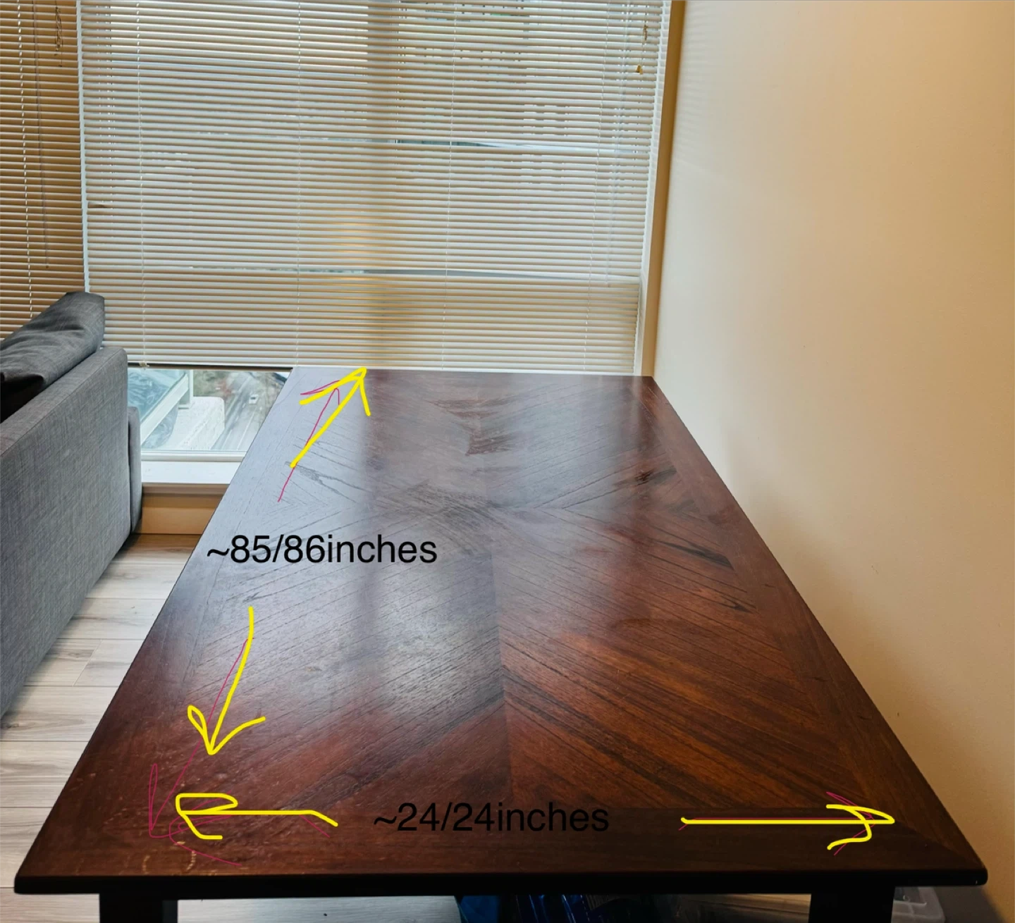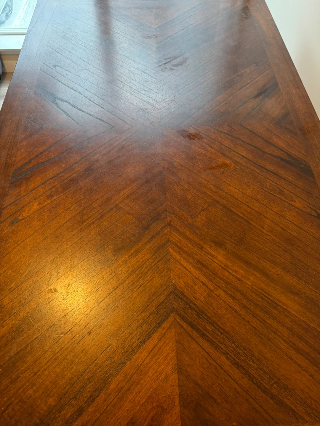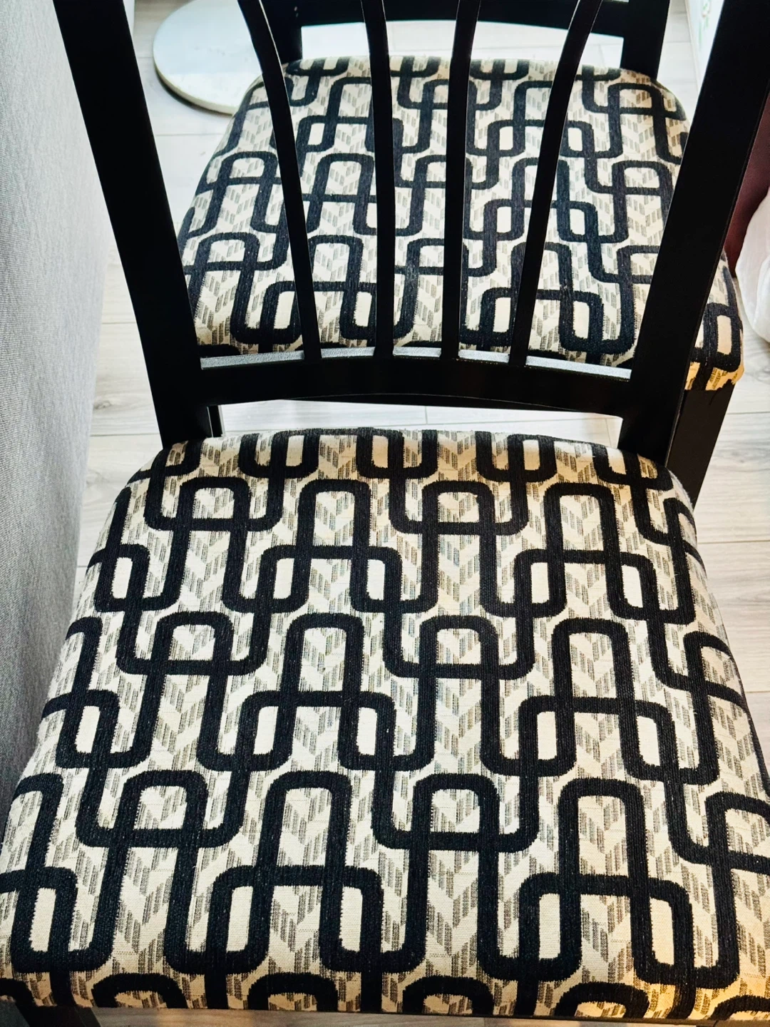 Selling a dining table and chairs set. The table is approximately 85 inches long and 24 inches wide. The chairs have a black frame with a patterned seat cushion. Great for a dining room or kitchen!
