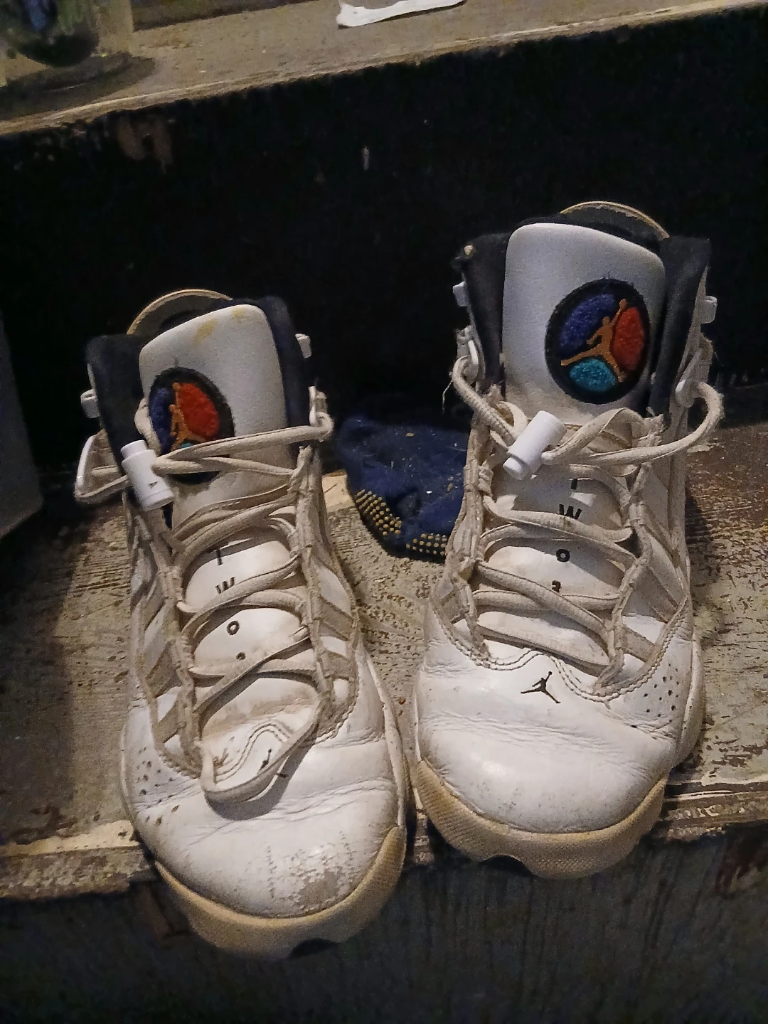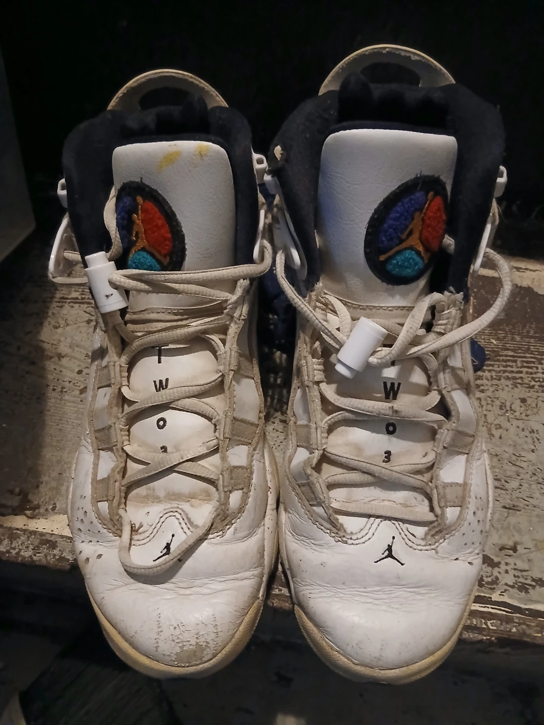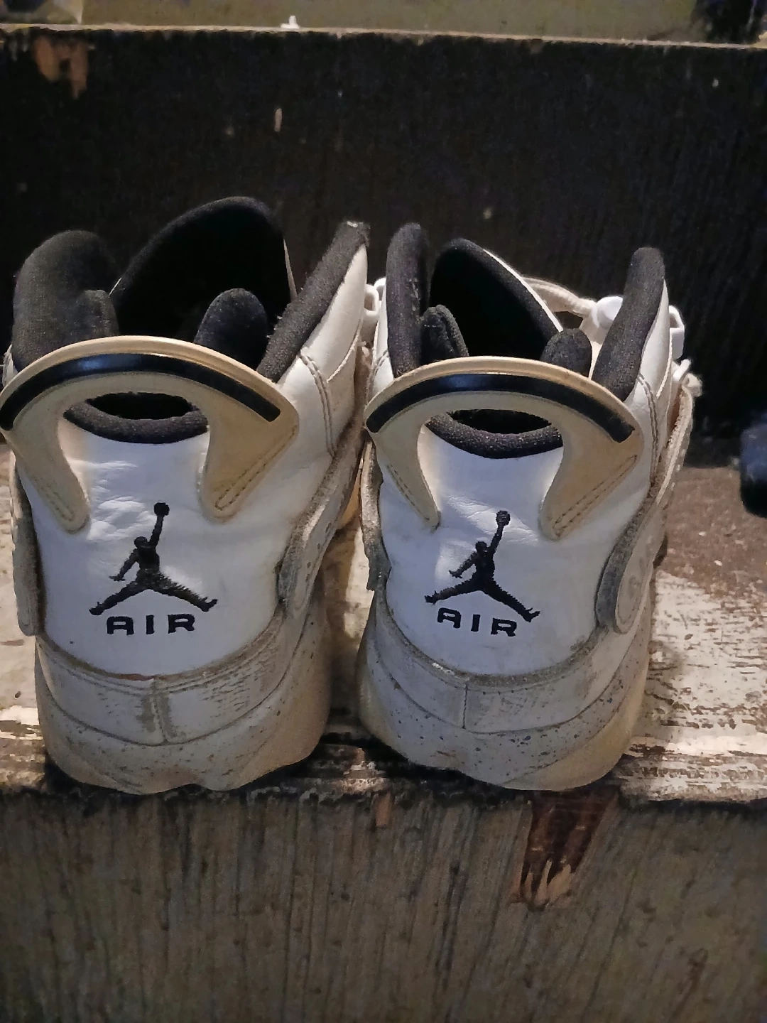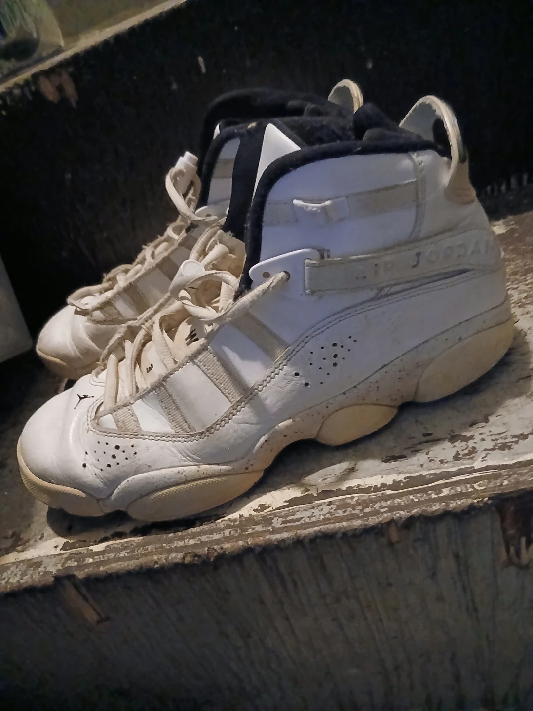 Selling a pair of Jordan 6 Rings sneakers in white. They are size 6.5 US. They have some wear and tear, but still have lots of life left!