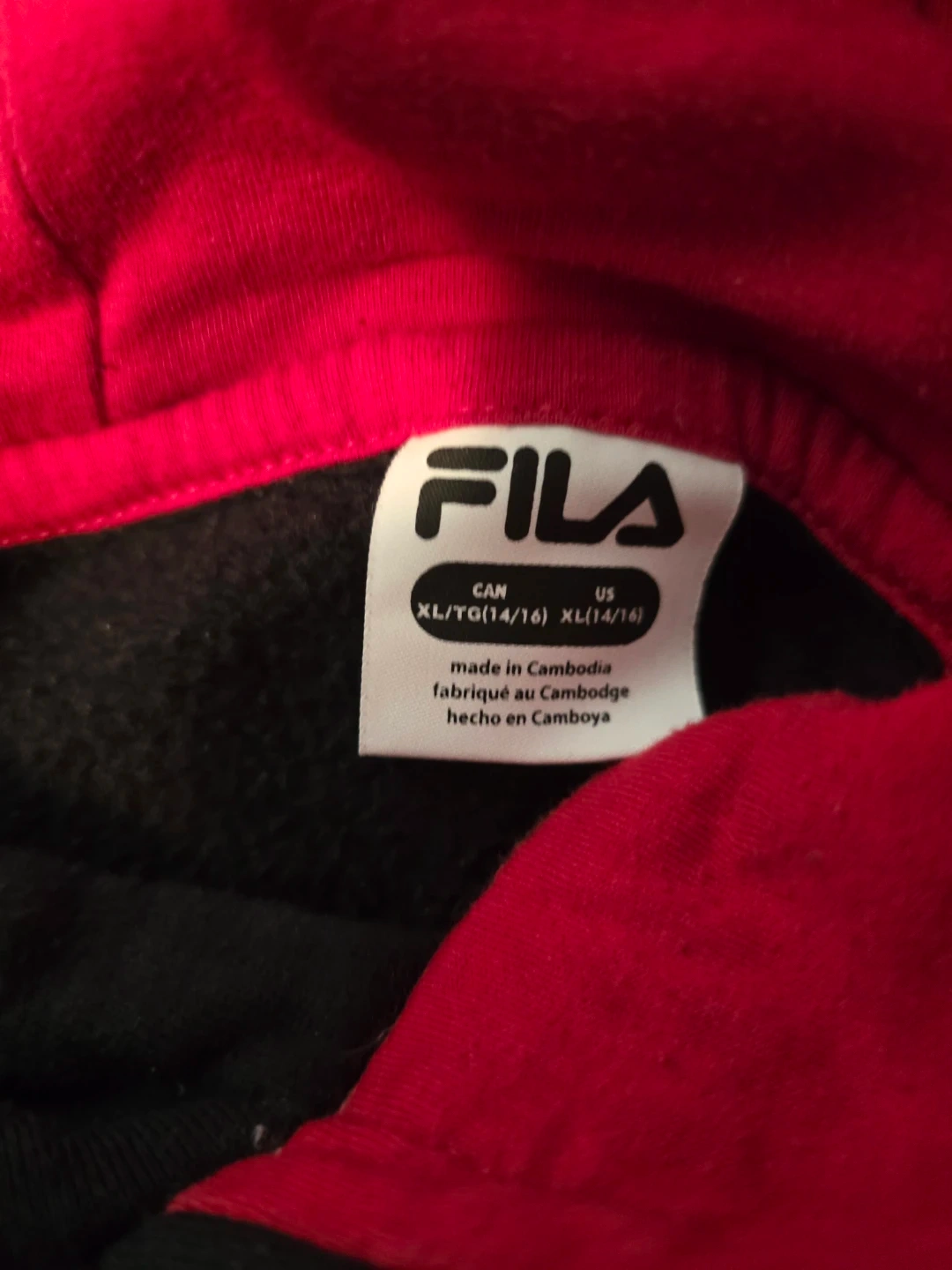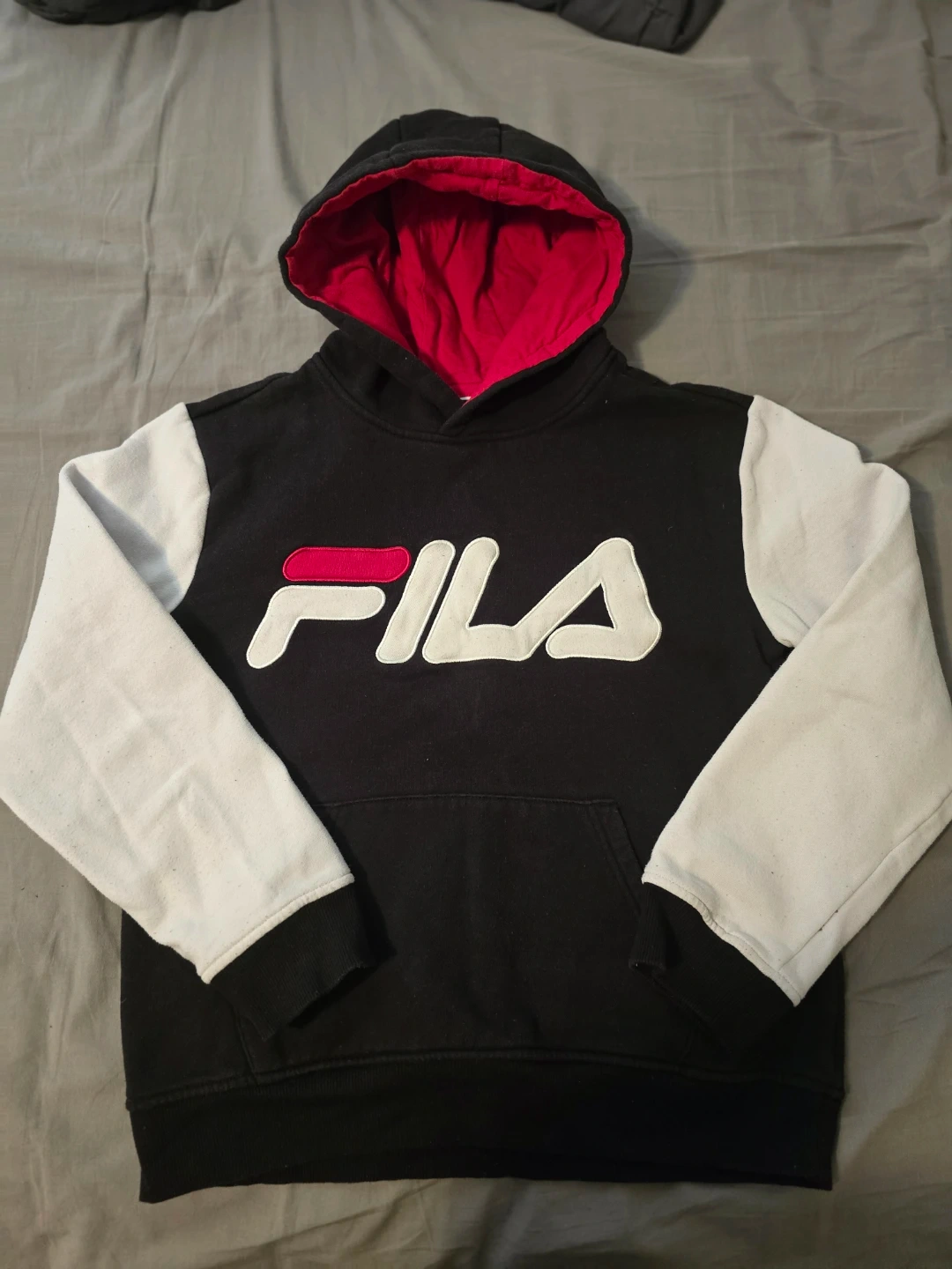 I'm selling a Fila hoodie in size XL. It's black with white sleeves and a red interior in the hood. It's in great condition!
