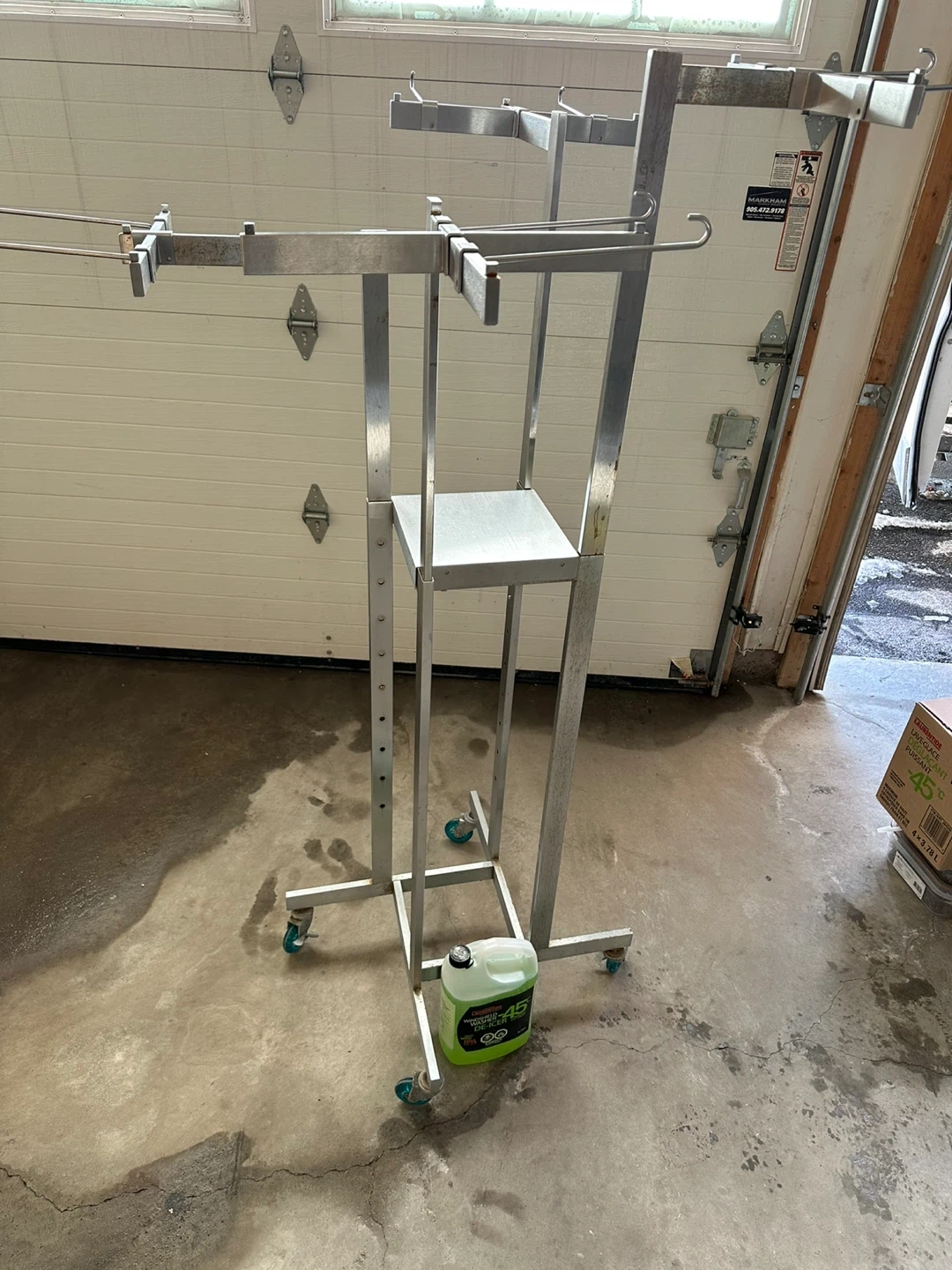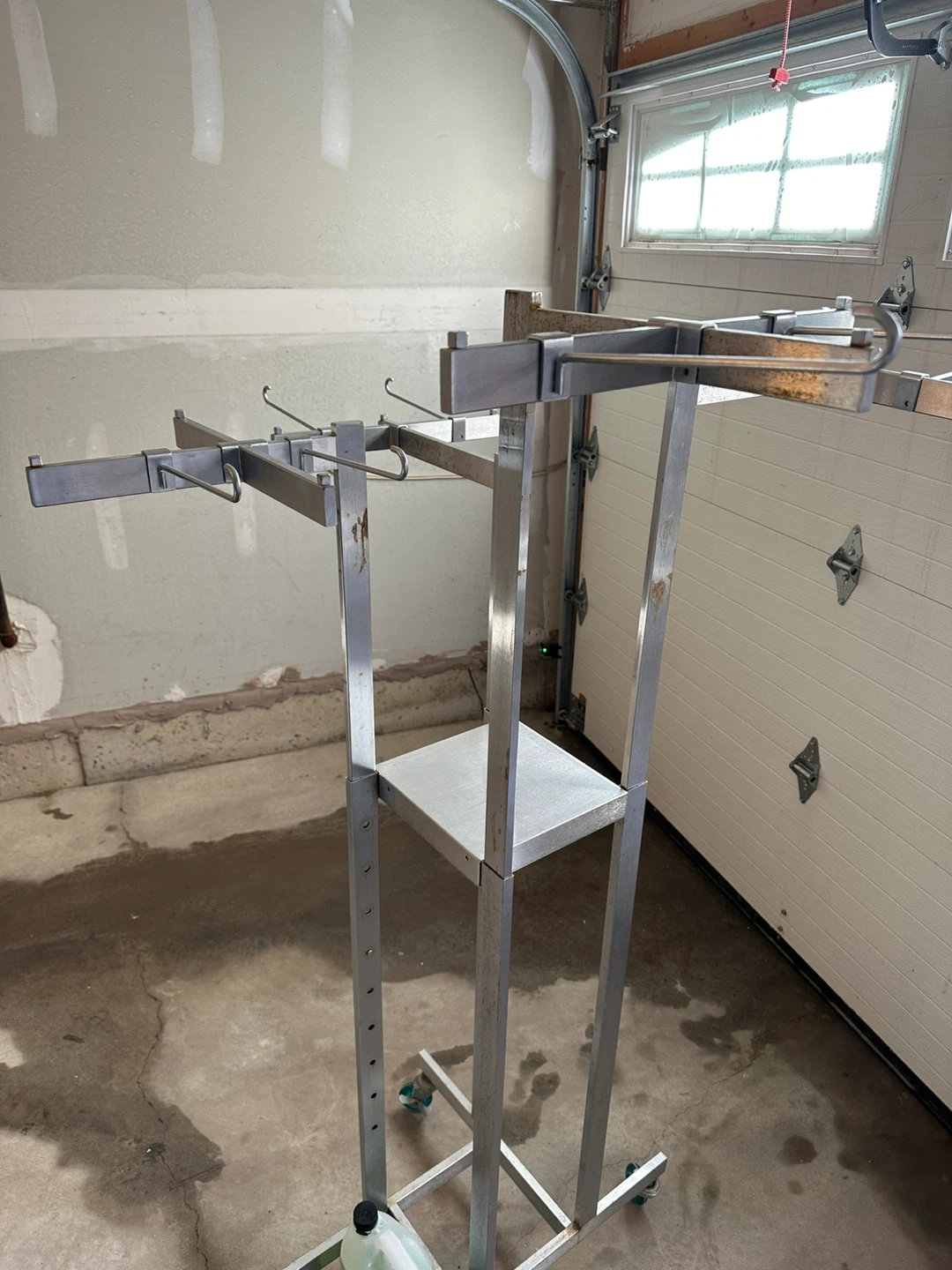Selling a sturdy clothing rack, perfect for organizing your wardrobe or displaying items in a retail setting! It's made of silver metal and comes with adjustable bars and a convenient shelf. Great for maximizing space and keeping your clothes wrinkle-free