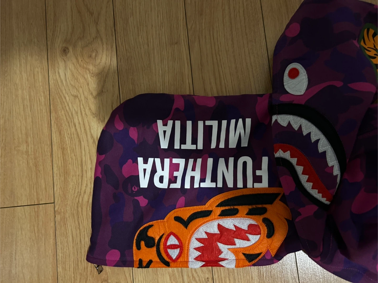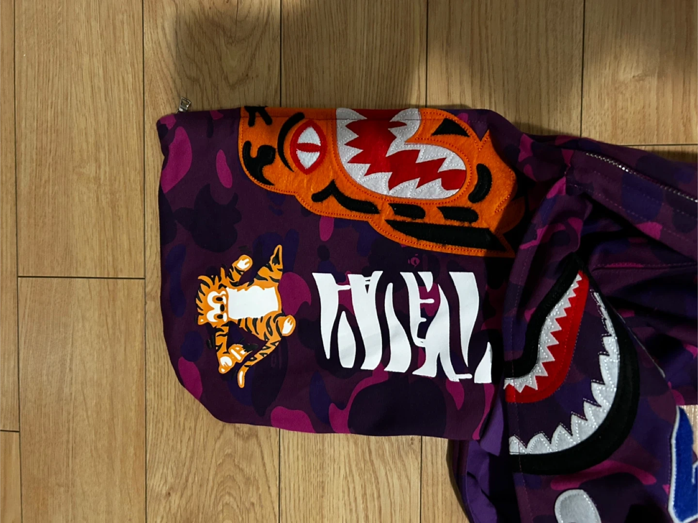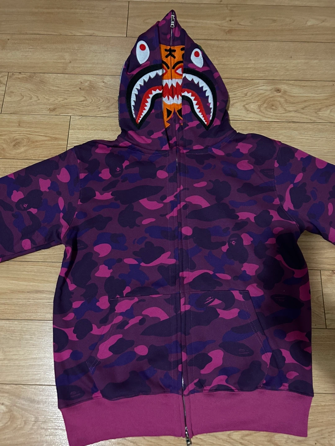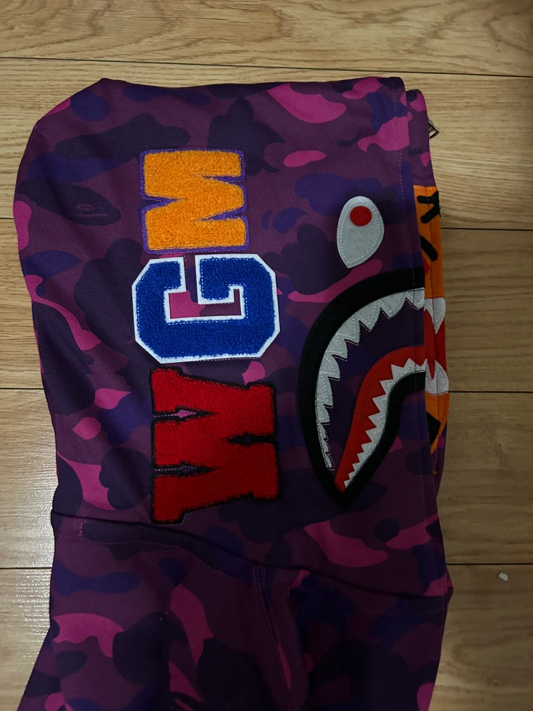 Selling a BAPE hoodie with a purple camo pattern and the iconic shark design on the hood! It's a real eye-catcher