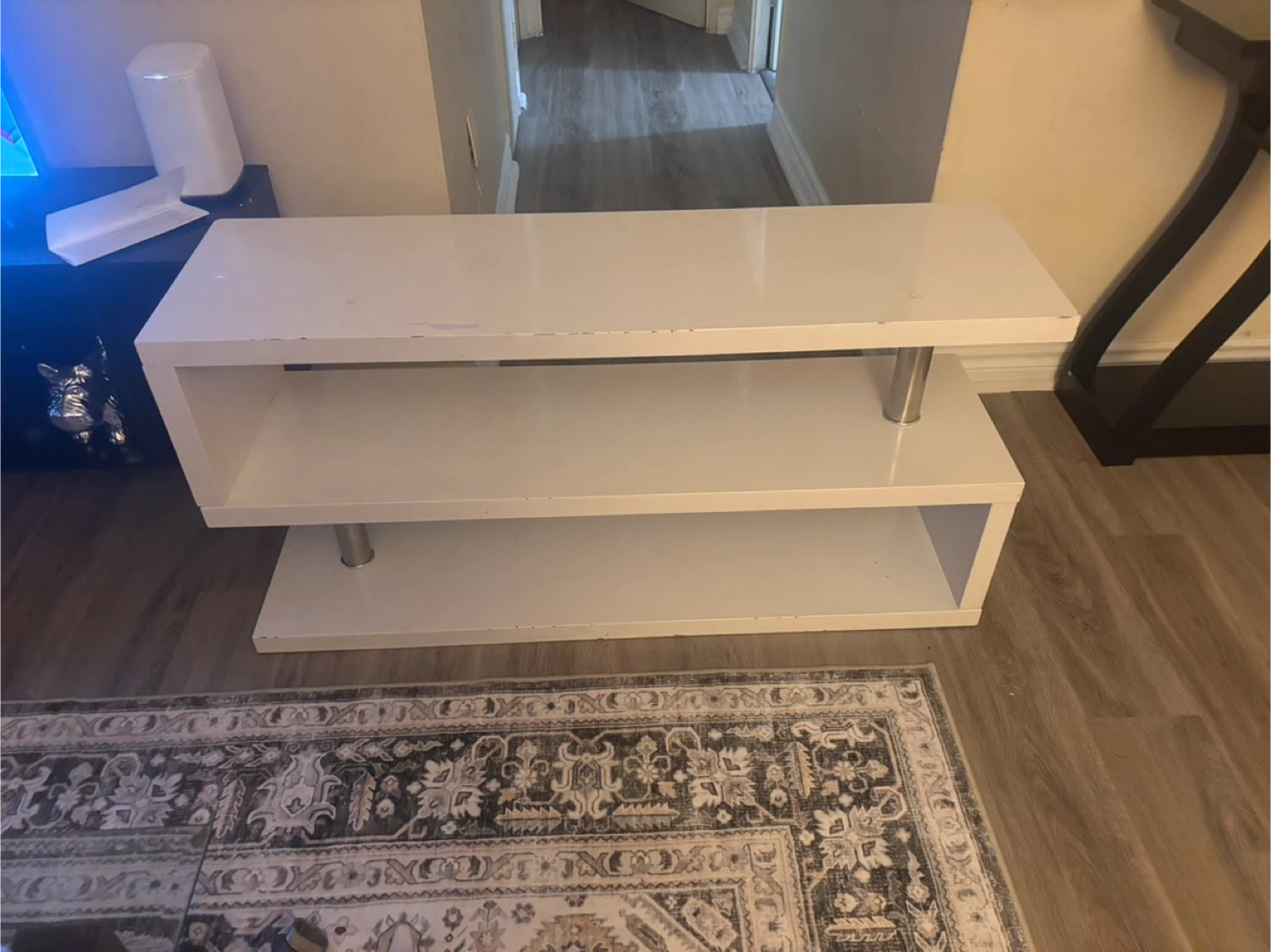 Selling a white TV stand. It has a modern design with two shelves, perfect for storing your media devices or displaying decor. There are some minor signs of wear, but overall it's in good condition and ready for a new home!