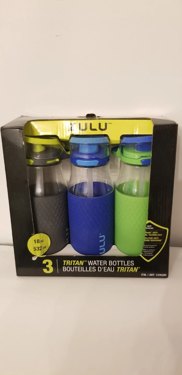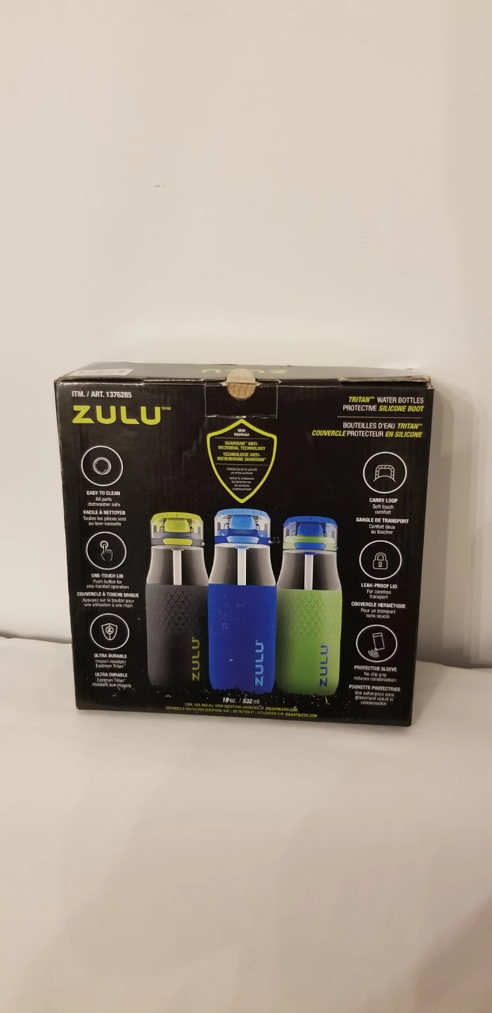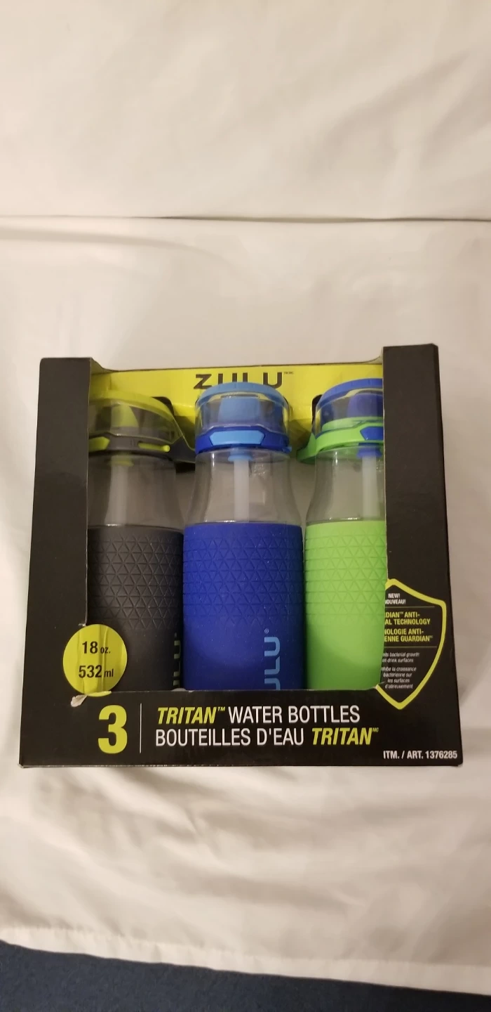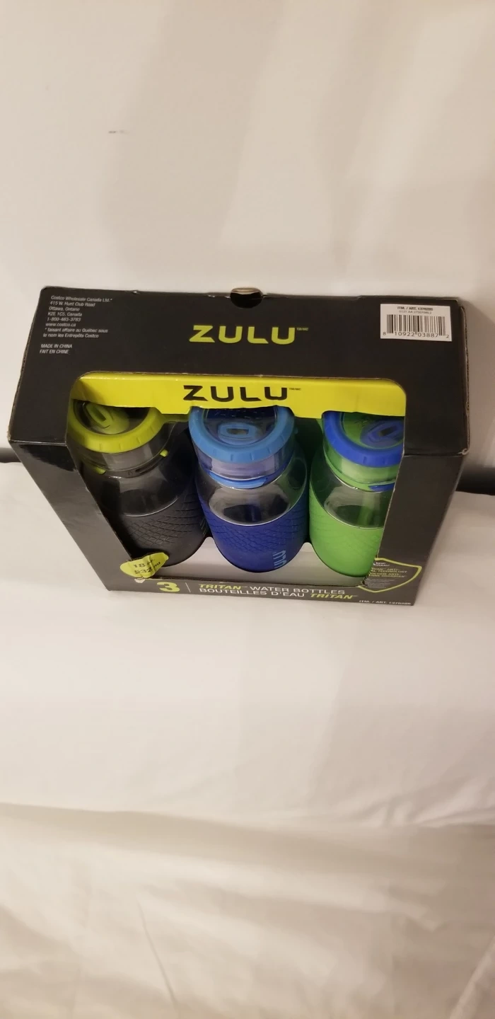 I have a brand new set of three Zulu Tritan water bottles! They're 18oz each and come in a variety of colours. These bottles feature a protective silicone boot and are easy to clean. The carry loop makes them easy to take on the go! The box is included.