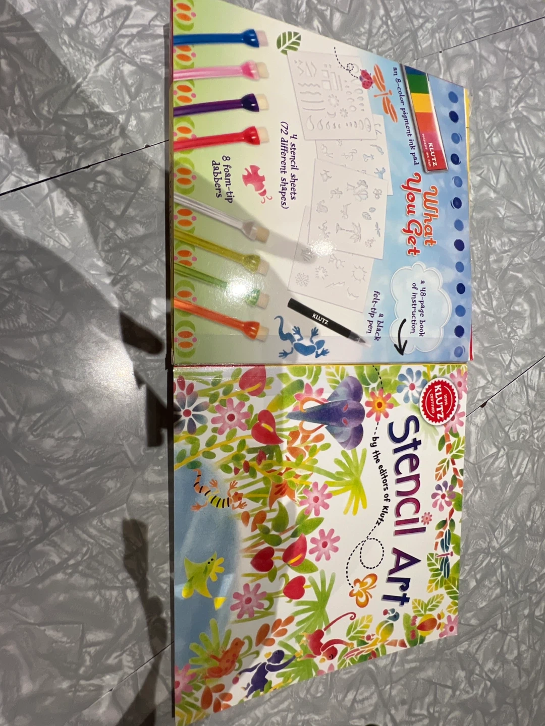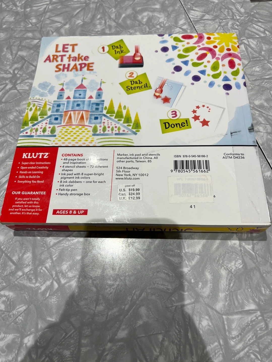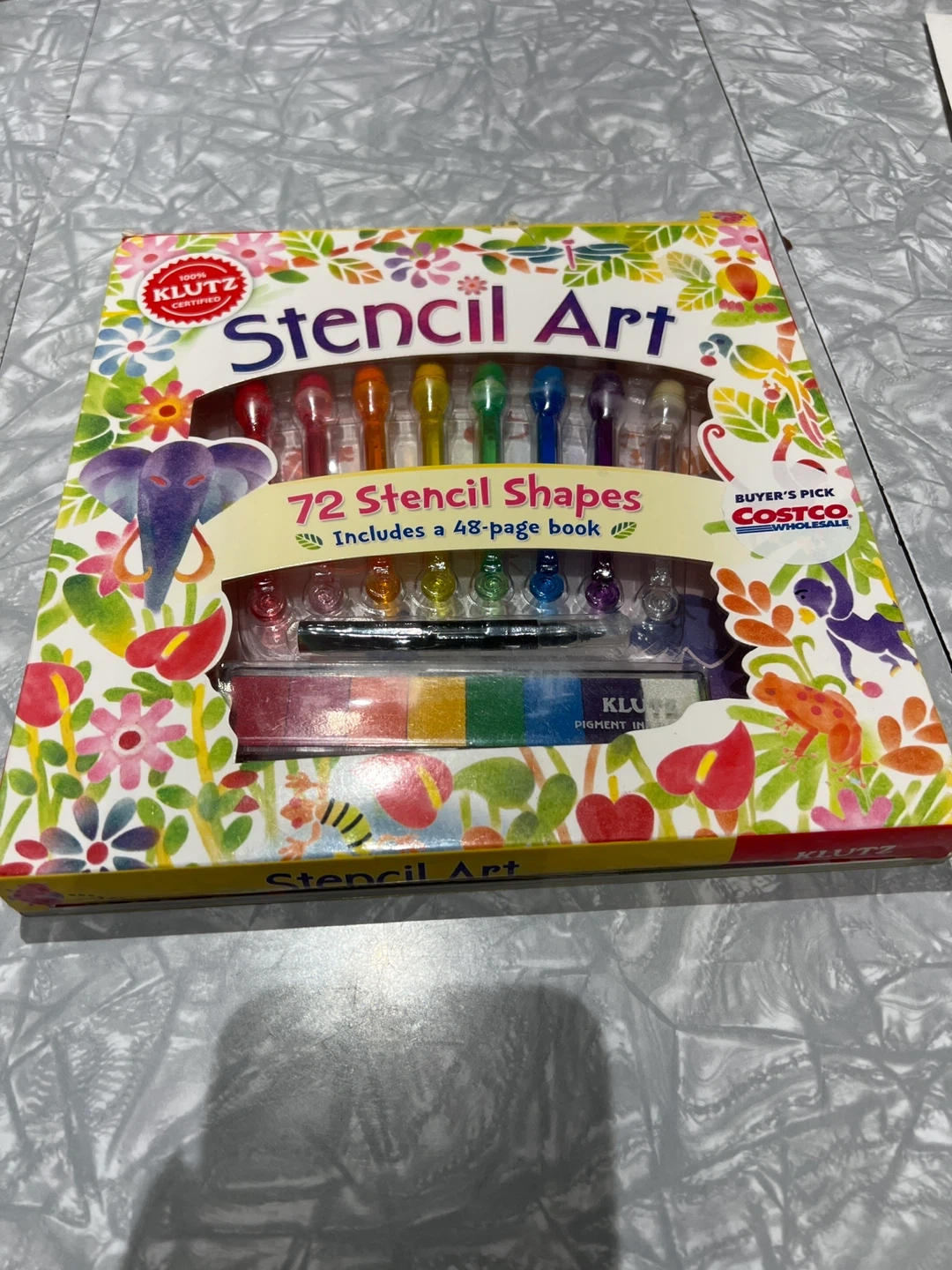 Get creative with this Klutz Stencil Art set! It includes 72 stencil sheets with different shapes, 8 dab-tip markers, and a 48-page book of instructions. Recommended for ages 8 and up. Perfect for sparking creativity and building skills!