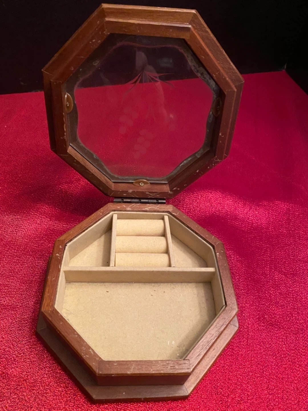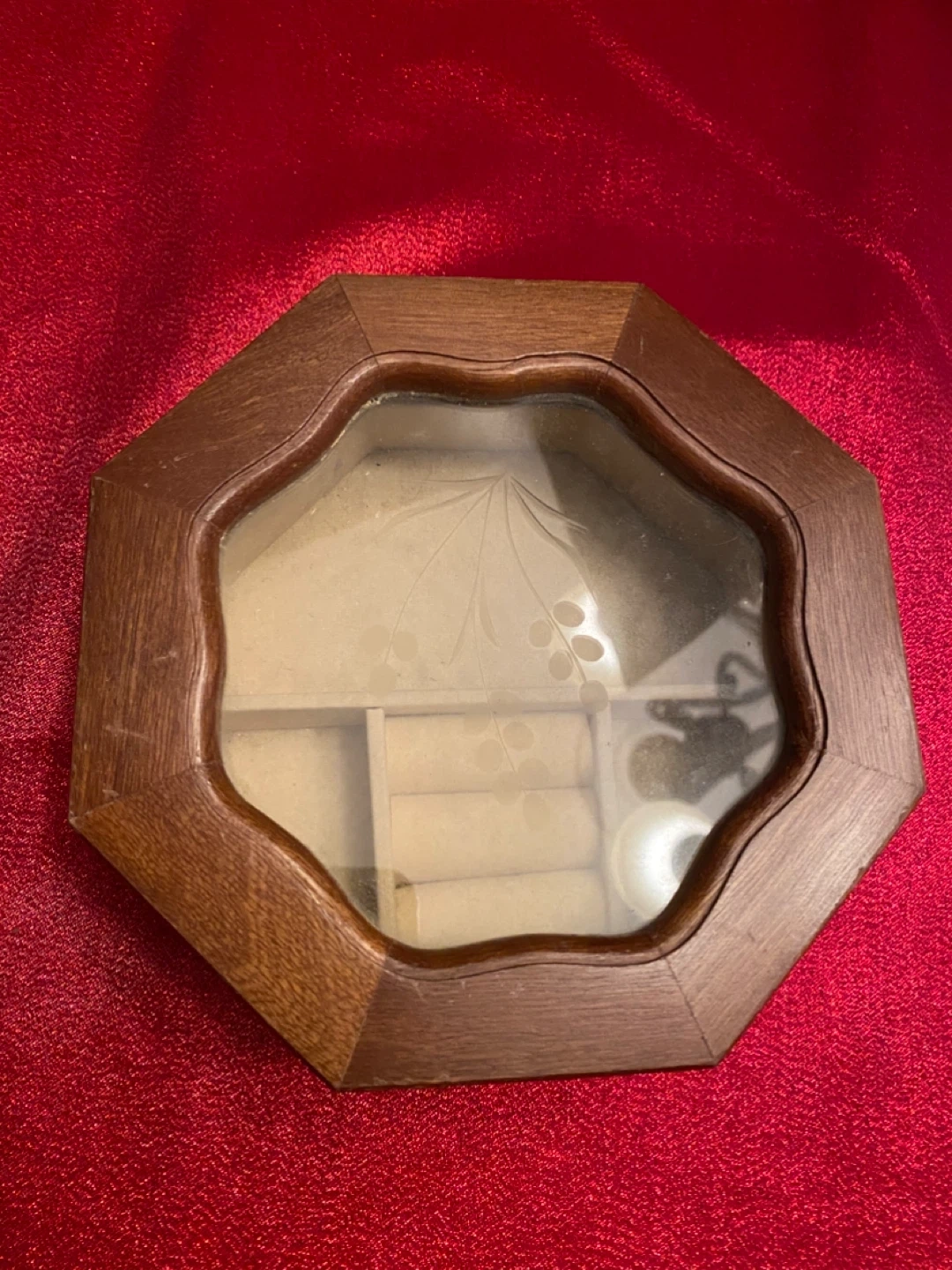 Selling a cute wooden octagon-shaped jewelry box! It has a glass top with a delicate floral design etched on it. Perfect for keeping your favourite pieces organized