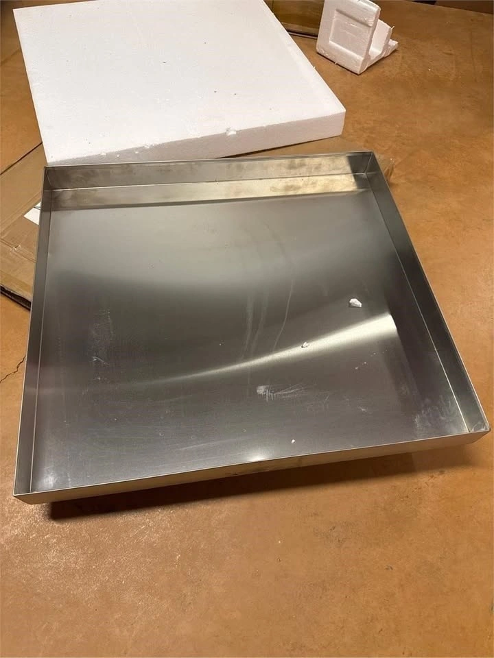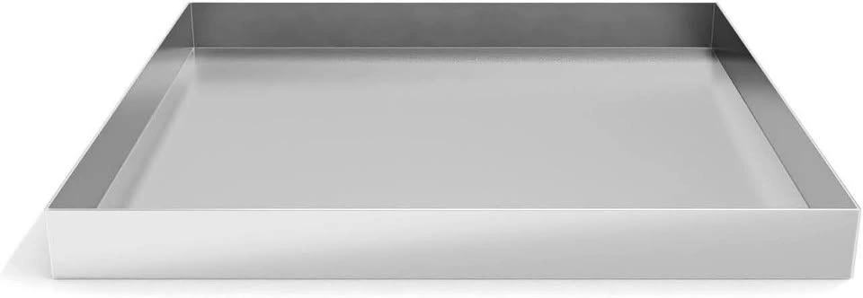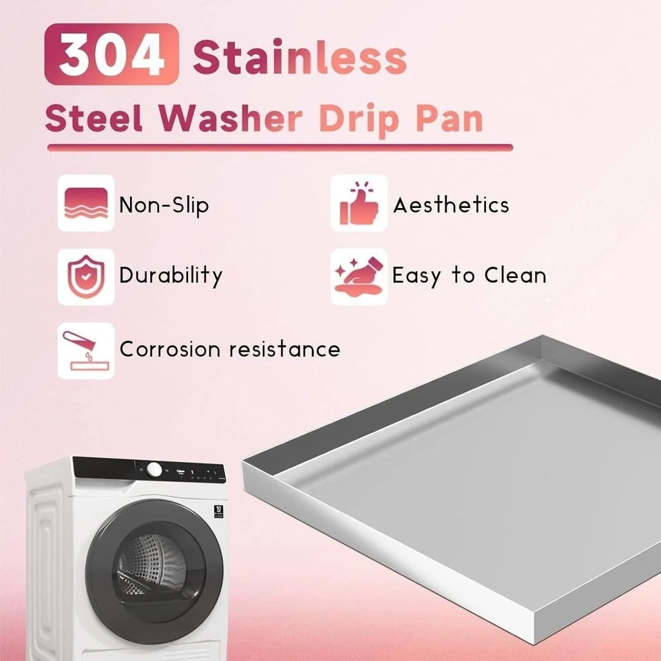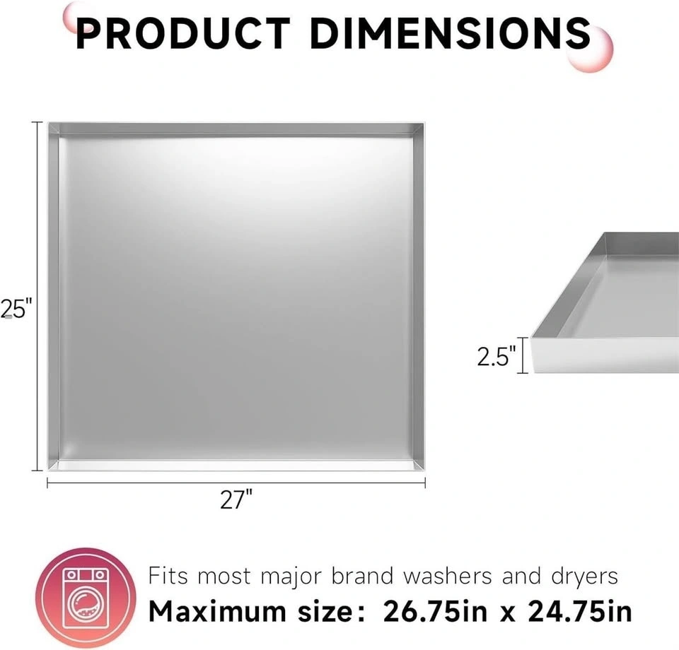 Universal Size 27' x 25' x 2.5' washing machine drain pan. This tray is for use in front-loading washers or spin dryers with a base size up to 26.75' x 24.75', it fits most standard washing machines. To ensure a good fit, please make sure your washer size before purchasing. 304 Stainless Steel Material Compare this with the traditional plastic washing machine drain pan, which can break over time. A washing machine pan made of 304 stainless steel is tough enough to withstand the weight of a washing machine and is easy to clean, reducing the growth of bacteria. Design Details The drain pan has a galvanized shiny polished finish that complements your appliances and home accessories. All four sides of the catch pan are folded, the corners are precision welded, and the edges of the catch pan are machined so that they won't scratch your hands. Considering that you or your children may accidentally trip over the protruding drain holes or even get injured during activities, we have reduced the number of drain holes in the drip tray. Perfect Protection Say goodbye to clutter with our heavy duty washing machine drain pan designed to catch leaks and prevent water from pooling on your floors! Ensure your laundry room stays clean and dry so your laundry room continues to look its best. Absorb any liquid residue by wiping with a sponge or dry cloth. Wide Range of Applications To maximize its functionality and efficiency, you can also try using it in a wider range of scenarios. Not only can they be used to protect your floors by preventing water leaks from washing machine trays, but they can also be used to replace drip pans on household appliances such as refrigerators and dryers, as well as stoves.