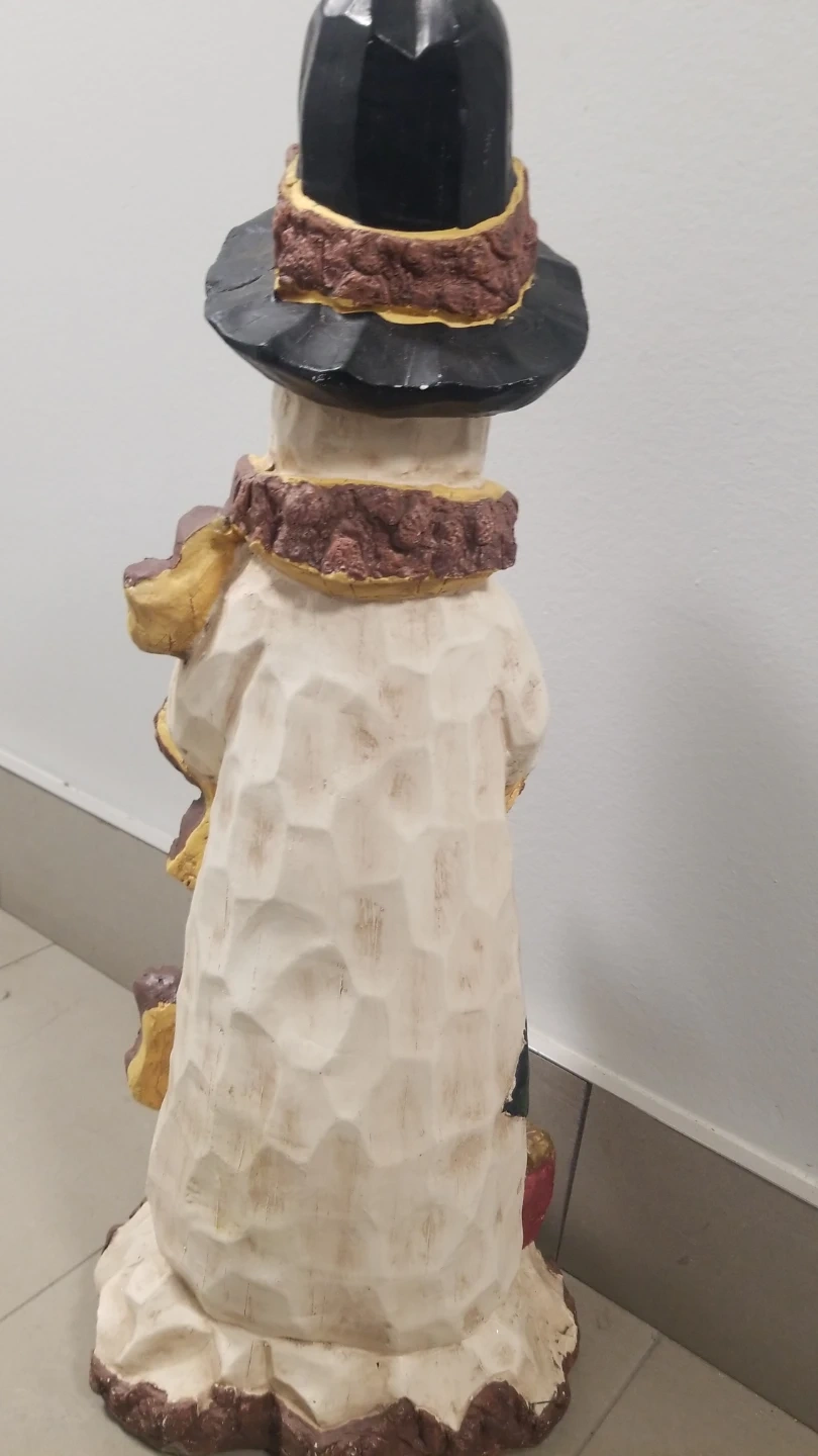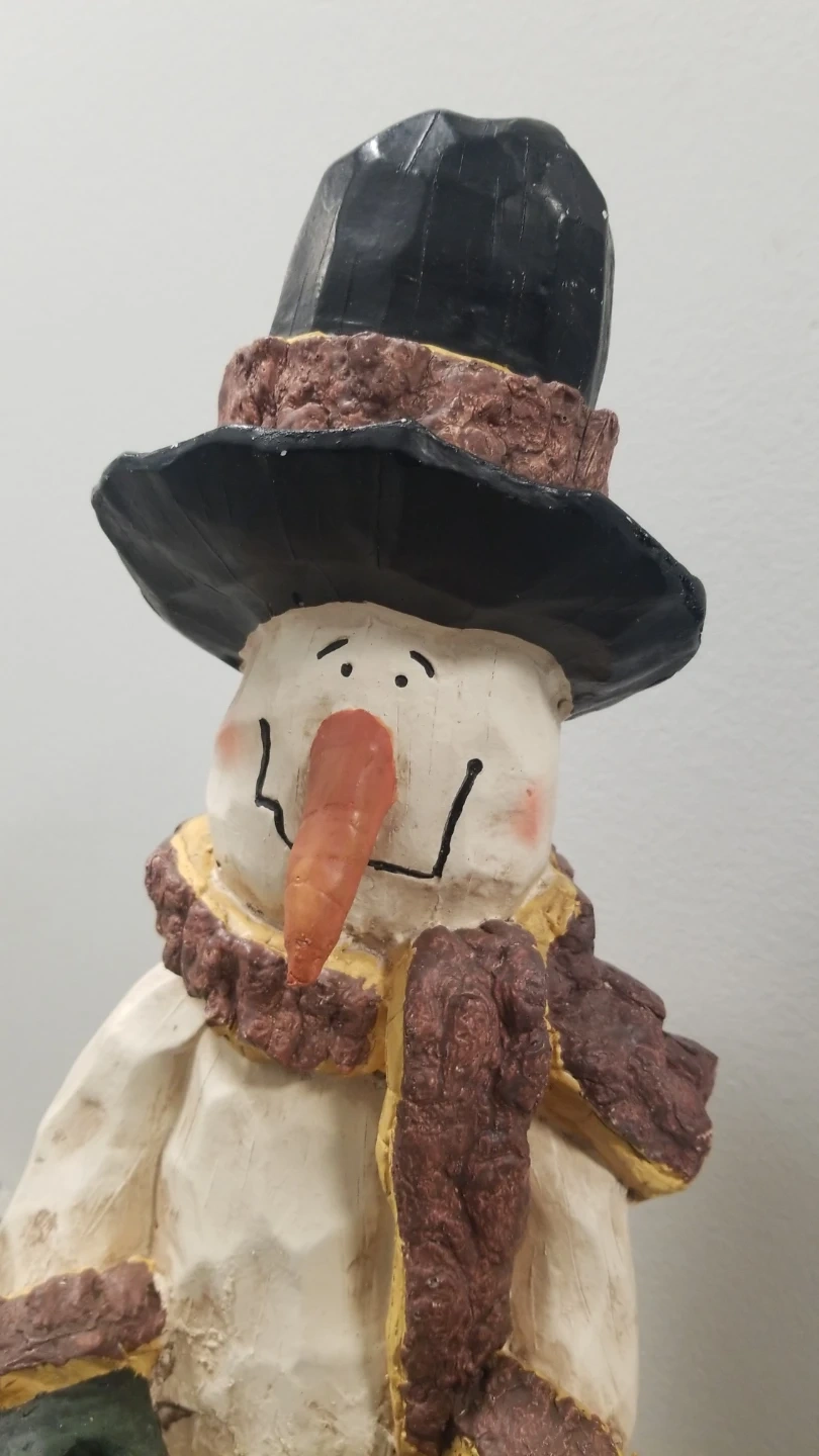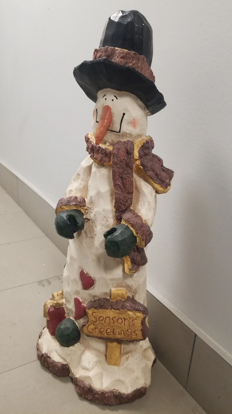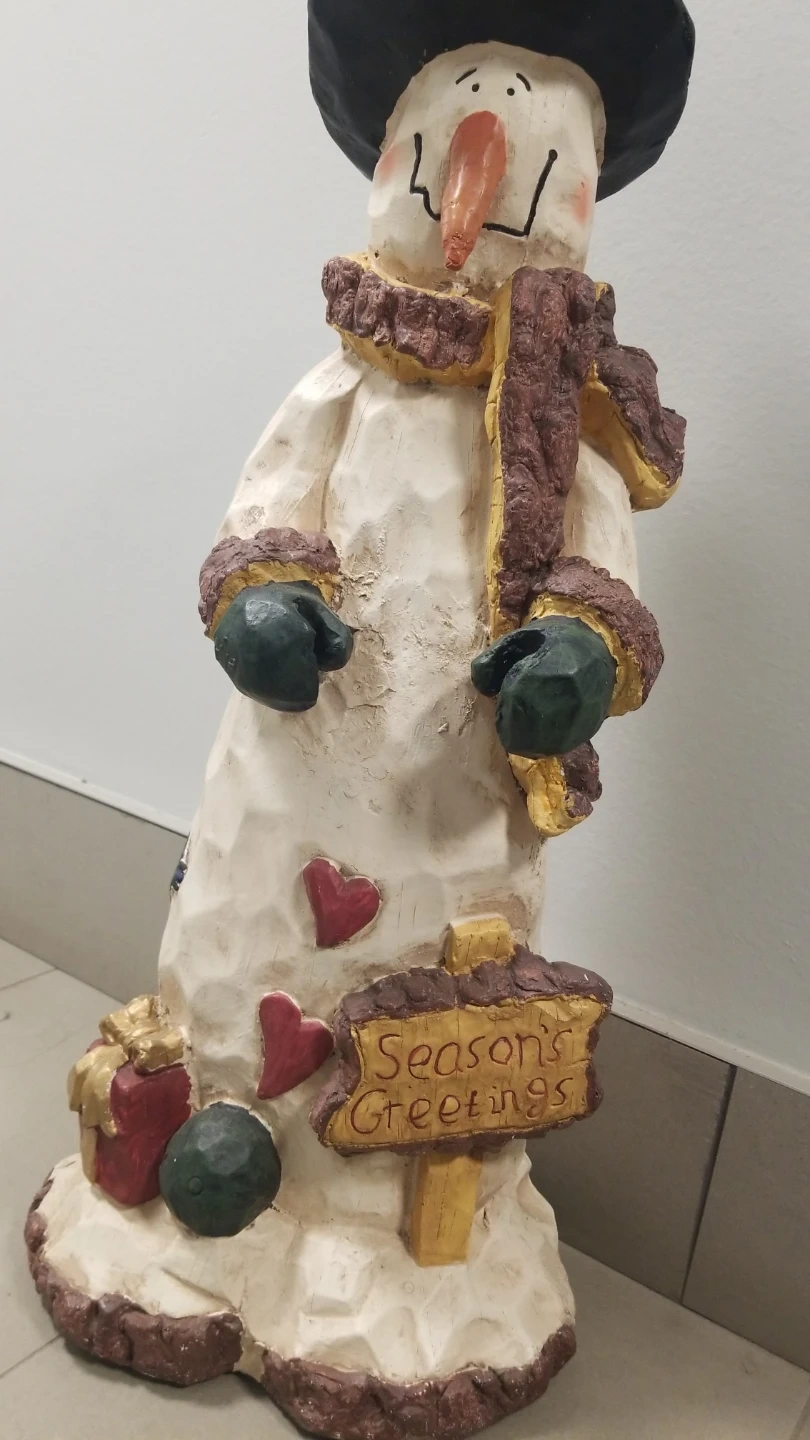 Selling a charming 3ft snowman figurine! It's wearing a black hat and a cozy scarf. The base features a cute 'Season's Greetings' sign, perfect for your decor during the holidays.