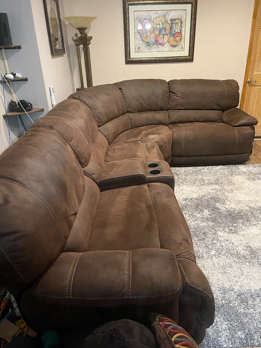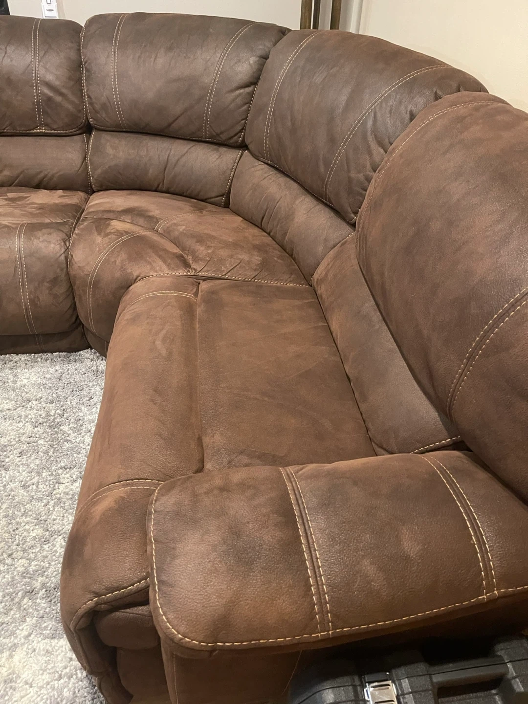 Selling a comfortable brown leather sectional sofa. It's a great piece for any living room. There are some signs of wear, but it's still in good condition for relaxing and lounging!