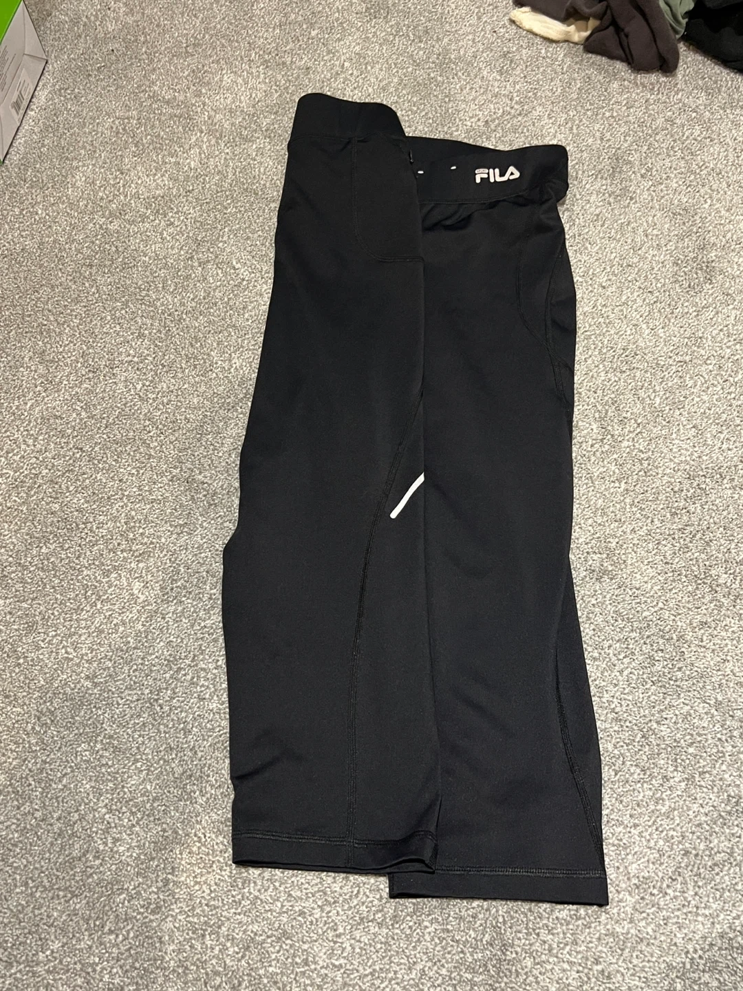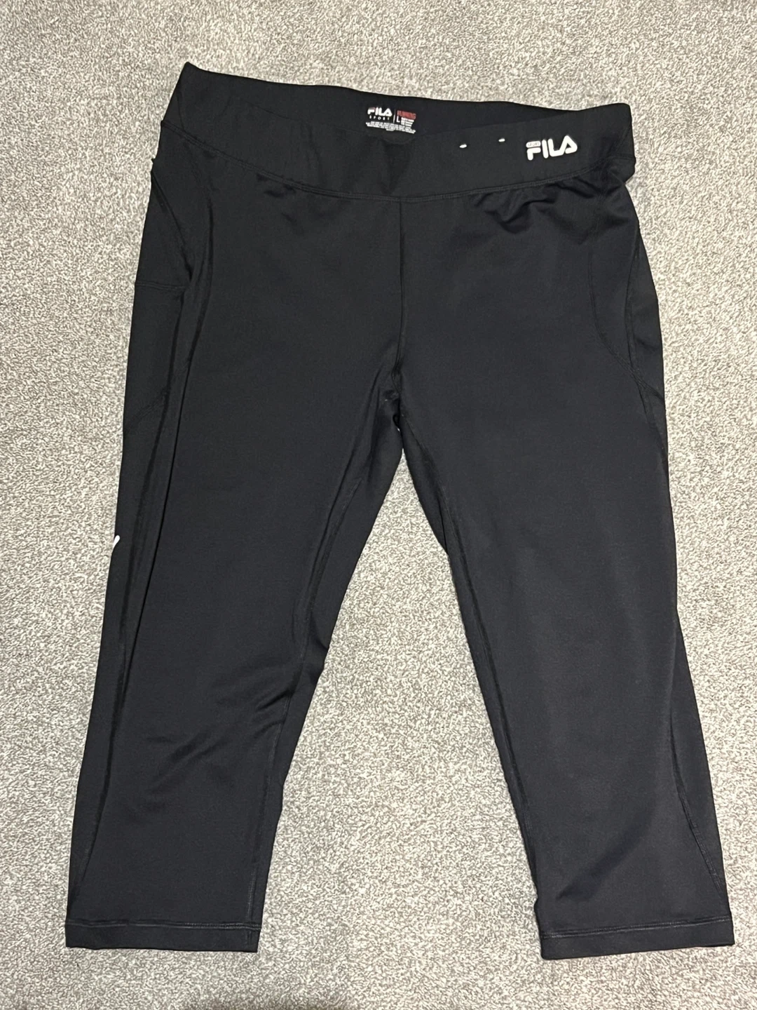 Selling a pair of Fila Sport running capri leggings in size L. They're black and made of 88% polyester and 12% spandex. Perfect for your workouts!