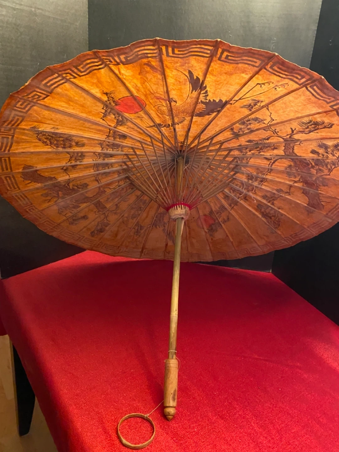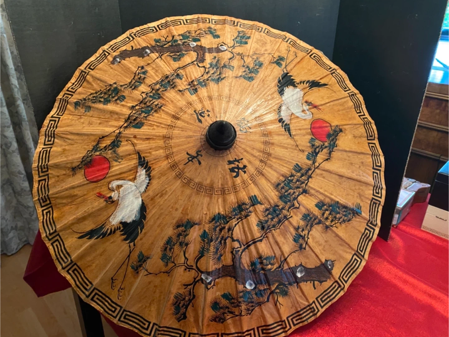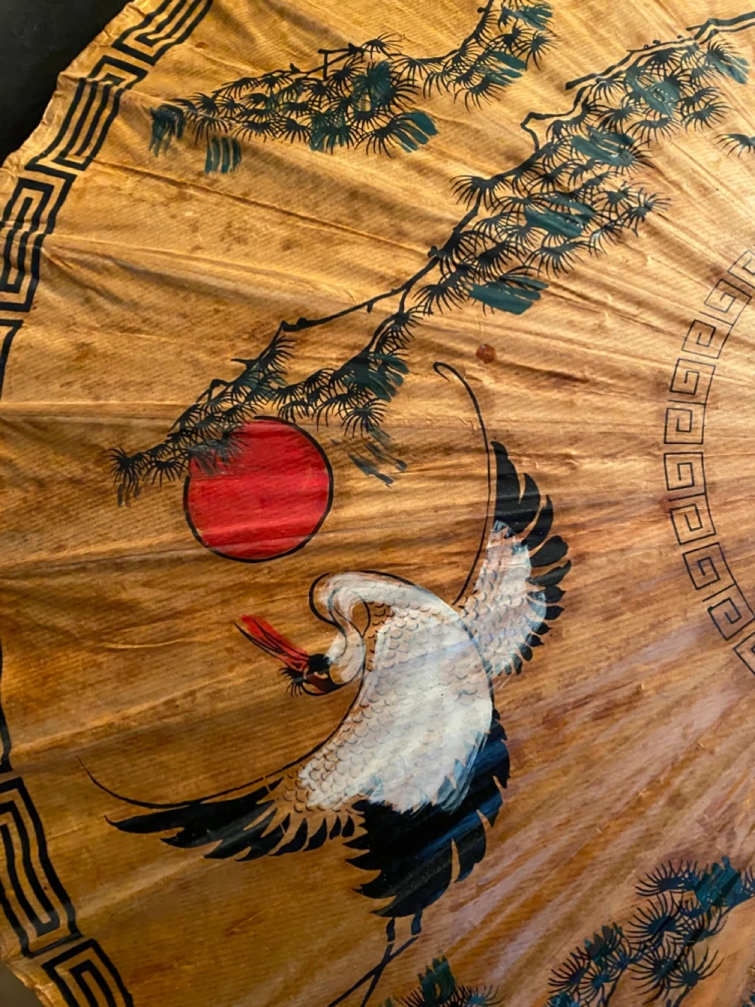 Selling a vintage Japanese parasol featuring a beautiful crane and pine tree design. It's a unique piece that would add a touch of elegance to any room. The parasol has a wooden handle and a decorative border. Perfect for collectors or anyone who appreciates vintage decor