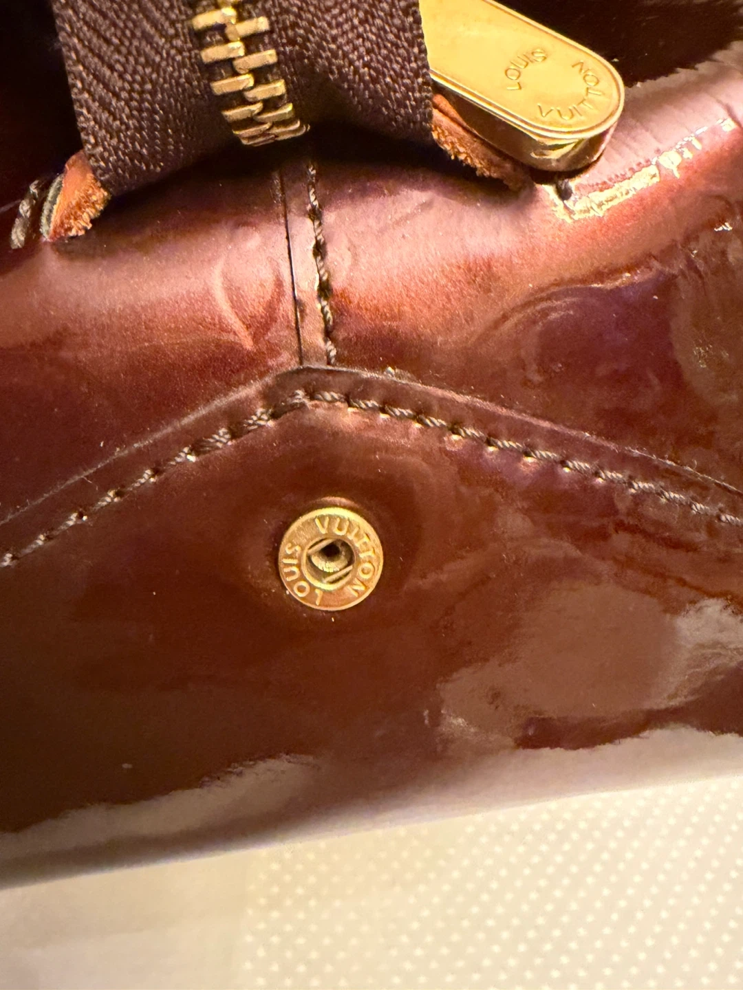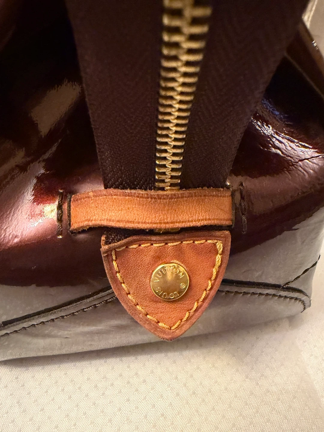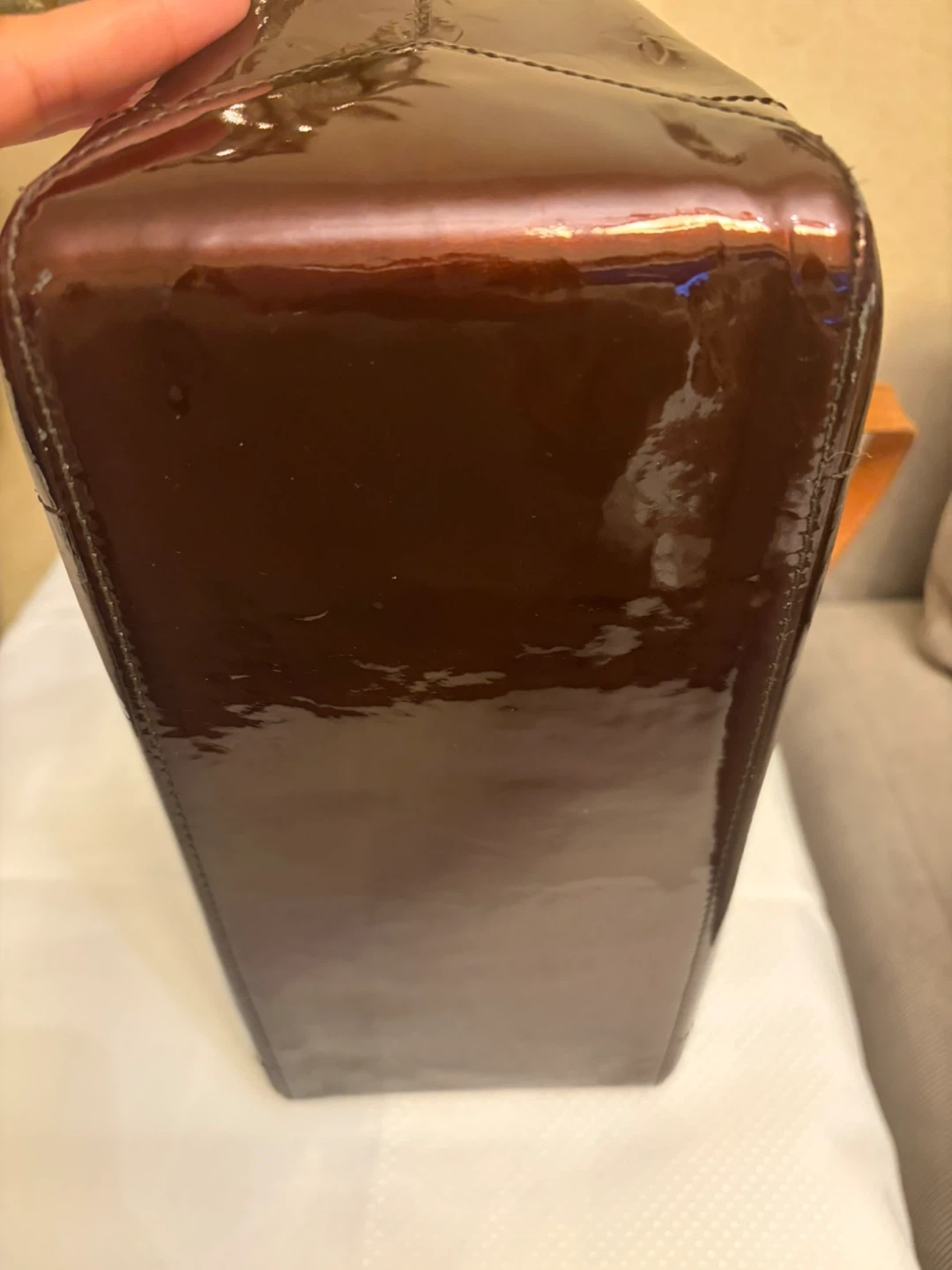 Selling a Louis Vuitton handbag in purple vernis leather. It's in good condition and ready for a new home, small dent in bottom and some peeling in bottom . Very clean inside Comes with COA.