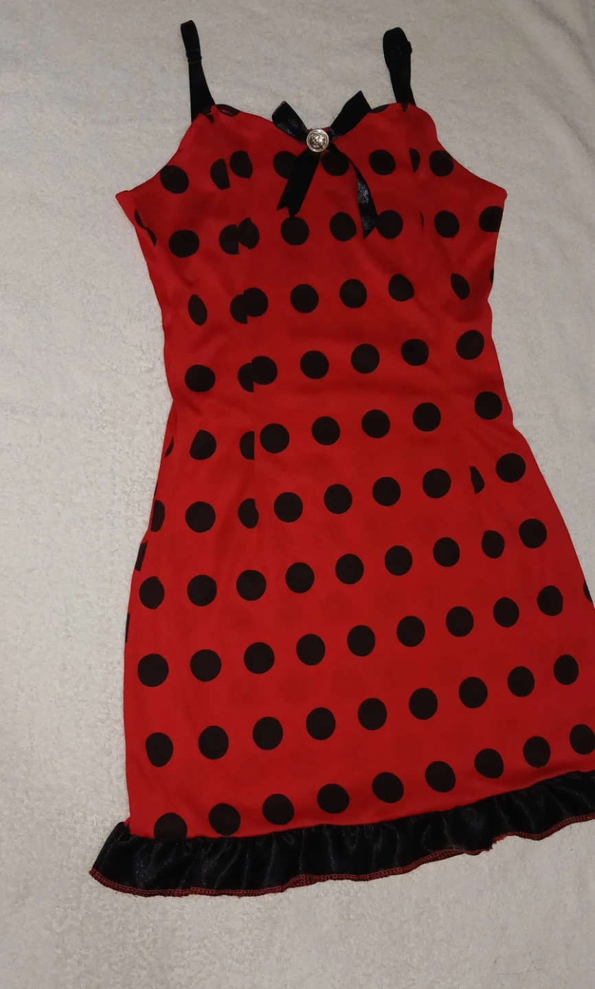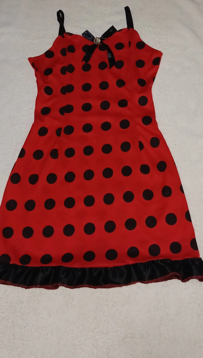 Here's a cute red dress with black polka dots! It has a little black bow at the top and a ruffled hem. Perfect for halloween or halloween parties !