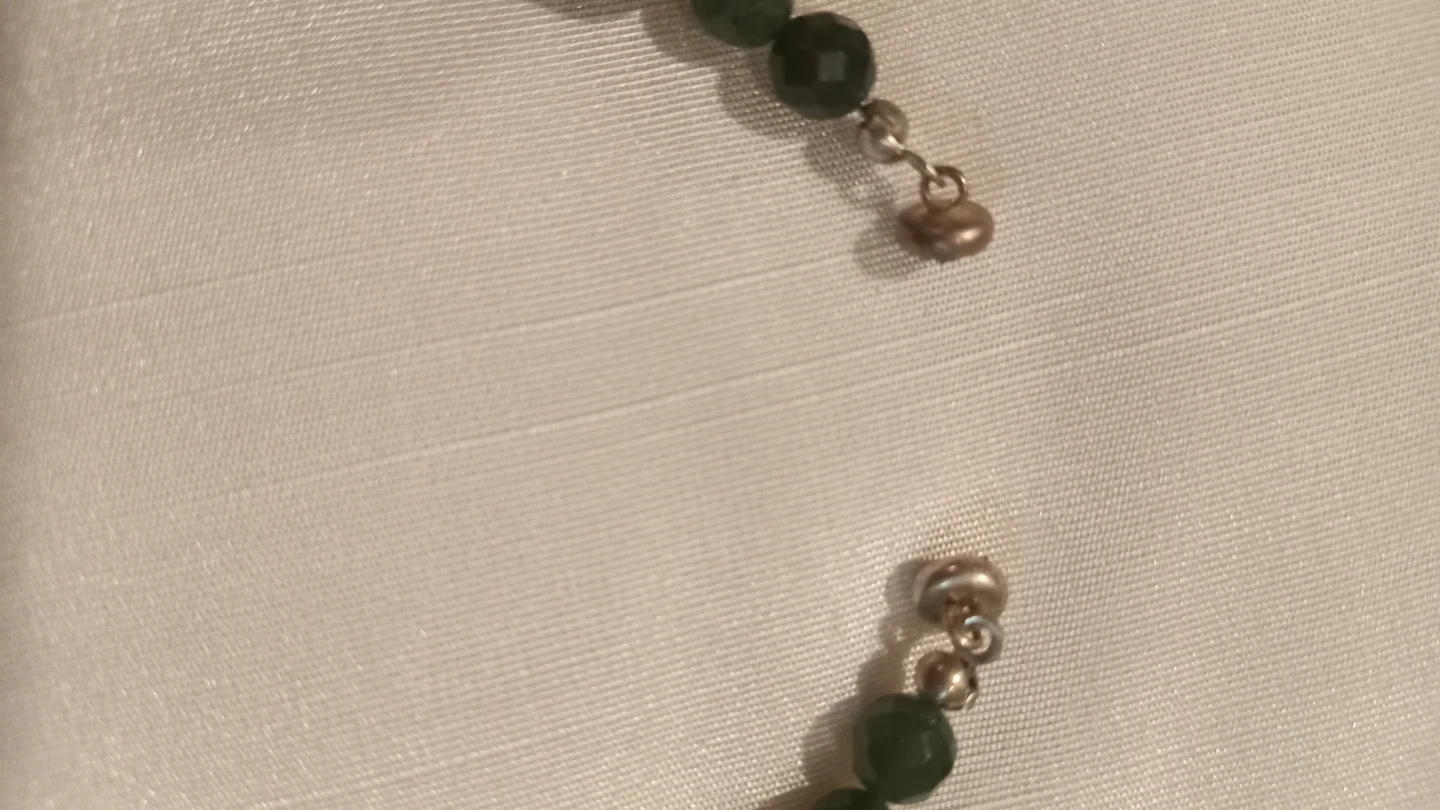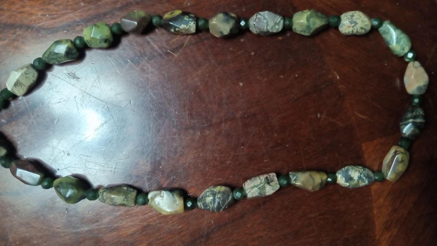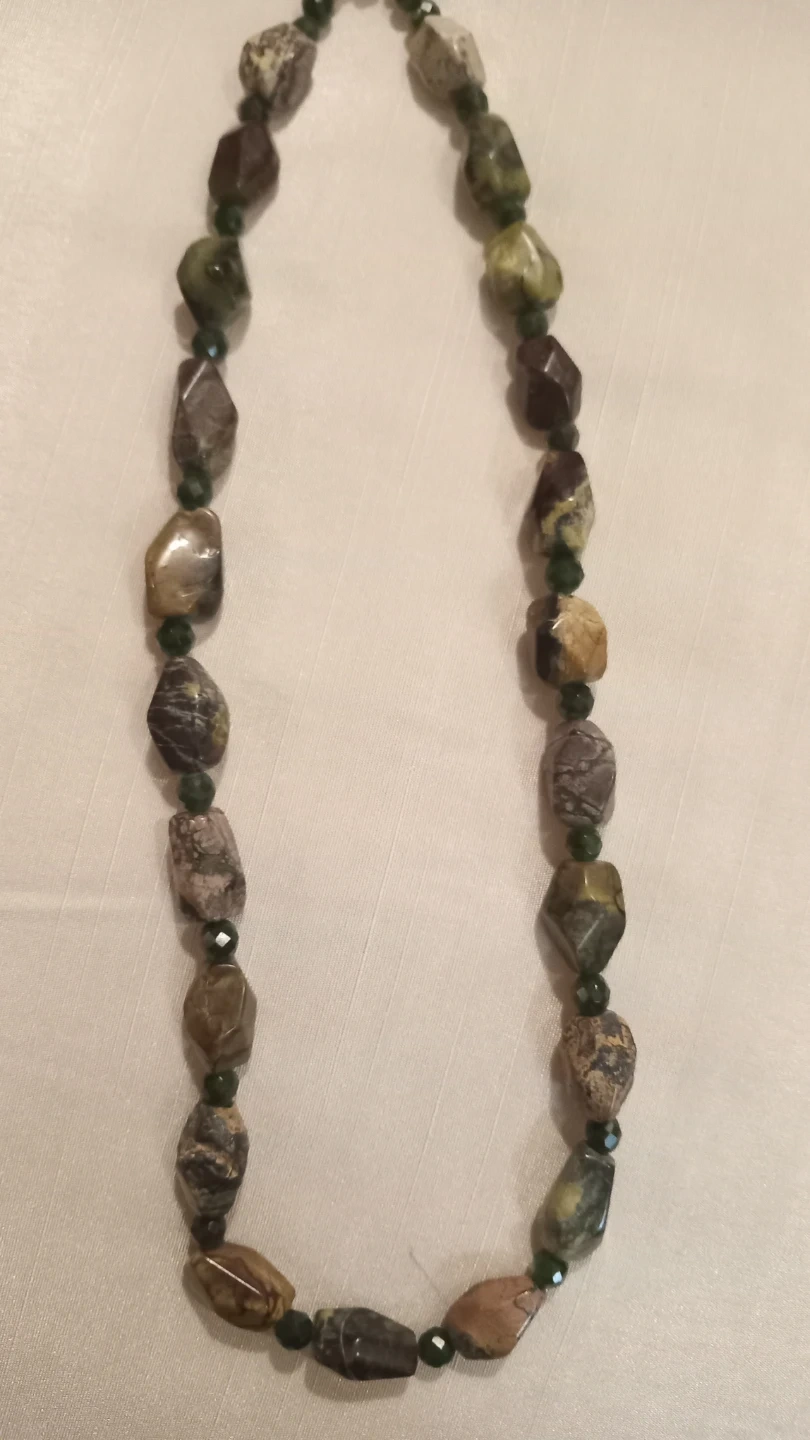 Selling a unique beaded necklace! It features a combination of larger, patterned stone beads and smaller, dark green faceted beads. A lovely piece to add to your collection!