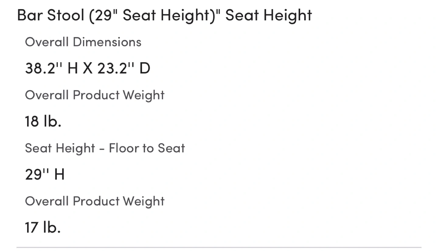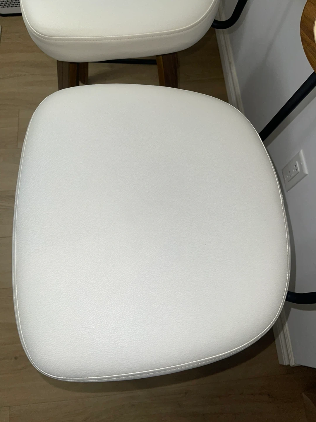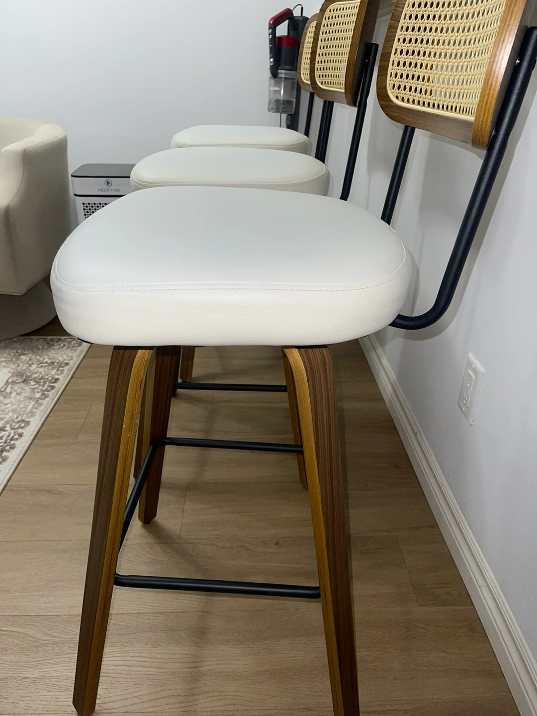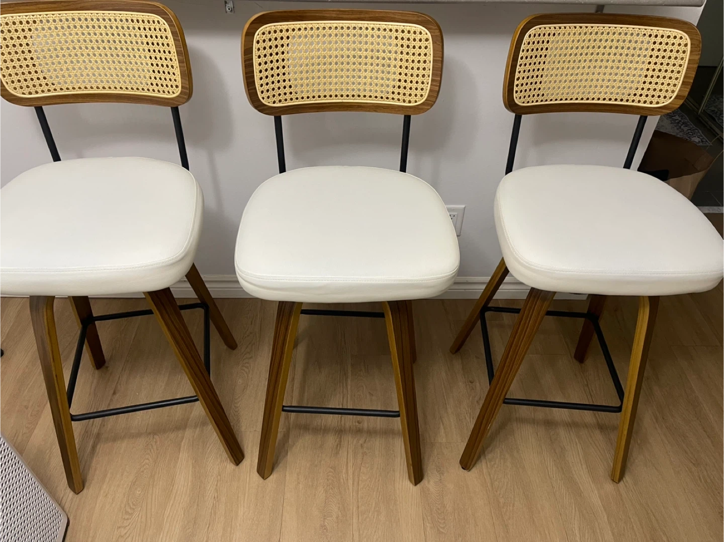 Selling a set of 3 bar stools. The seat height is 29 inches, and the overall dimensions are 38.2" H x 23.2" D. They have a white seat and a cane back. They're in great shape!