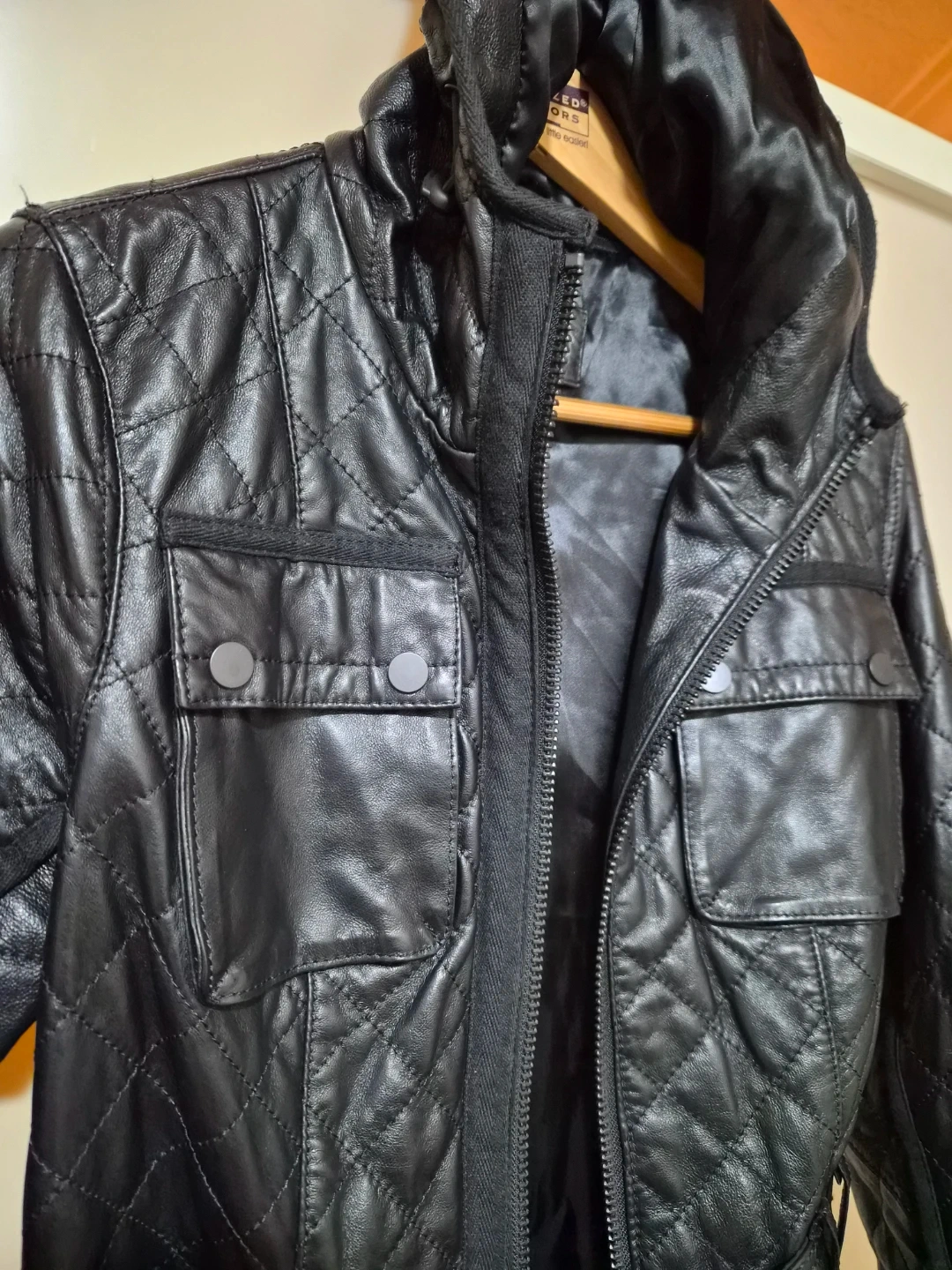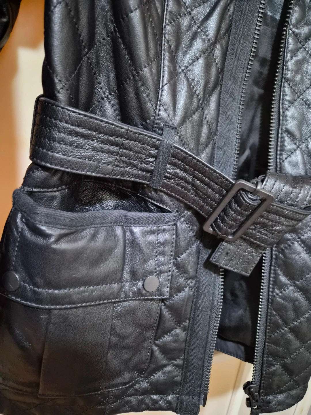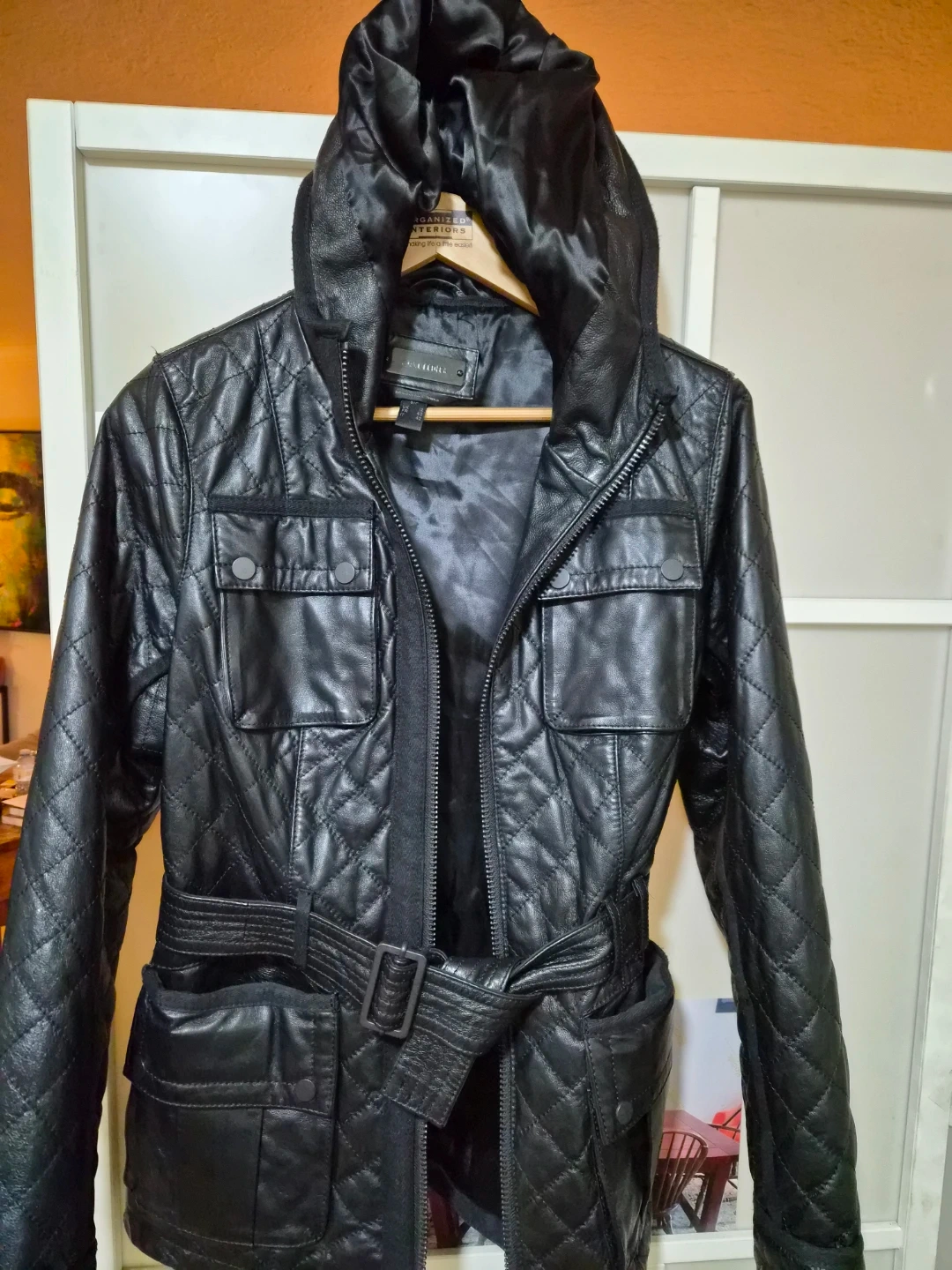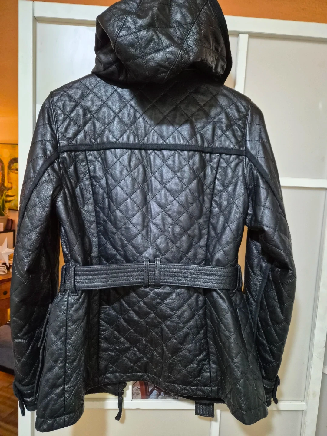 Selling a stylish black hooded leather jacket from Danier. It features a quilted design and a metal belted waist. Double pockets at the waist and pockets above and one inside pocket.