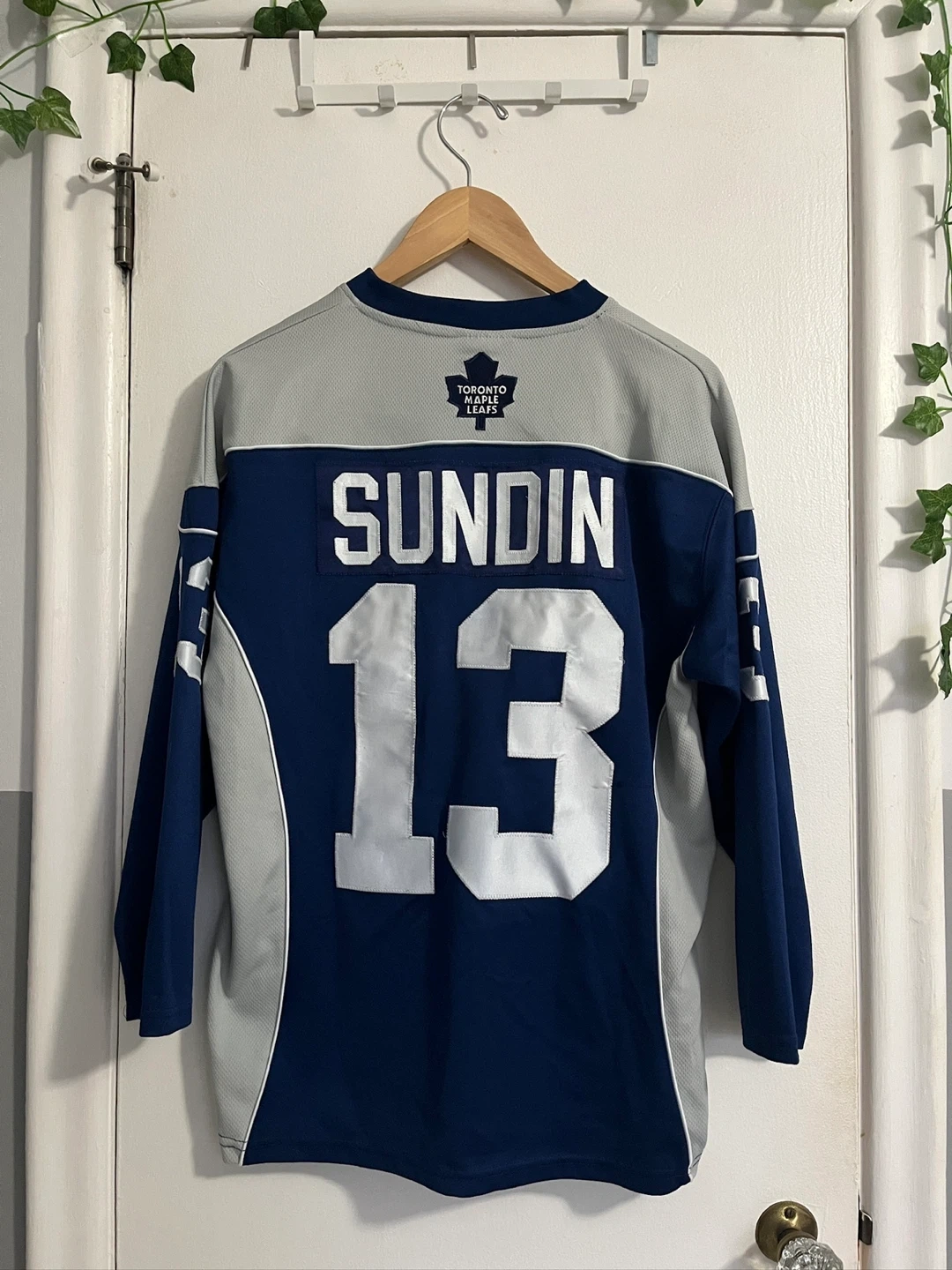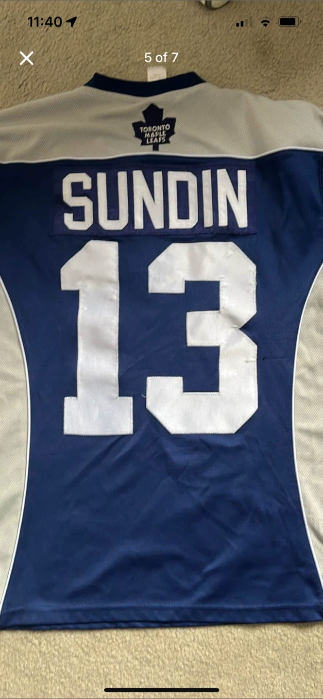 Selling a Toronto Maple Leafs hockey jersey with Sundin's name and number 13 on the back. It's in used condition, with some signs of wear. Please see the photos for details!