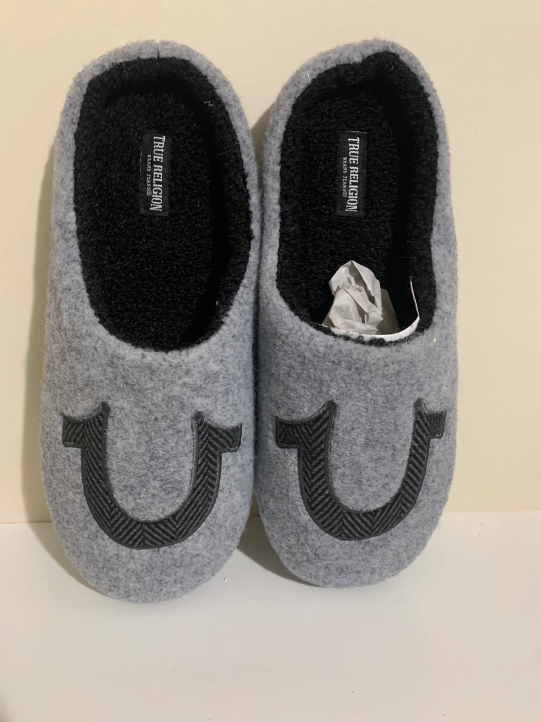 Cozy up with these True Religion slippers! They're a stylish grey colour and size 10. Perfect for keeping your feet warm around the house