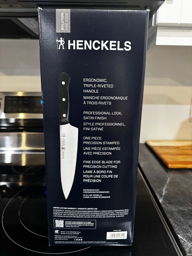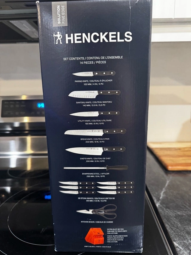 I'm selling a brand new Henckels 14 piece knife set, featuring fine edge, premium stainless steel blades and ergonomic, triple-riveted handles for precision cutting. This set includes a variety of knives for all your kitchen needs, neatly organized in a stylish knife block. Set Contents: * Paring Knife * Utility Knife * Chef's Knife * Bread Knife * Santoku Knife * Sharpening Steel * Kitchen Shears * Steak Knives (6) * Knife Block