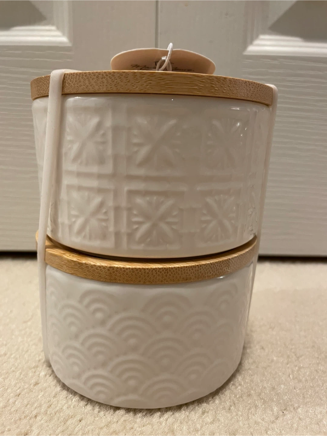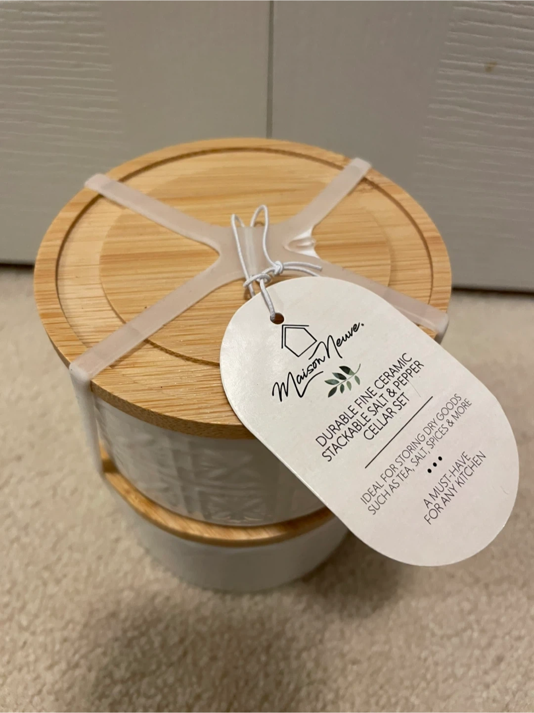 Here's a Maison Neuve durable fine ceramic stackable salt & pepper cellar set! It's ideal for storing dry goods such as tea, salt, spices & more. A must-have for any kitchen
