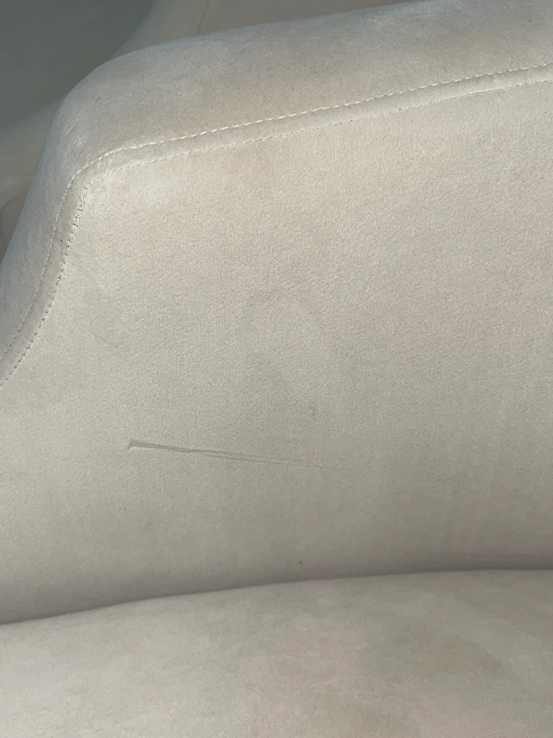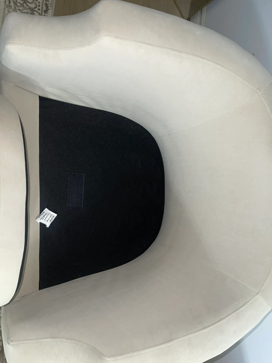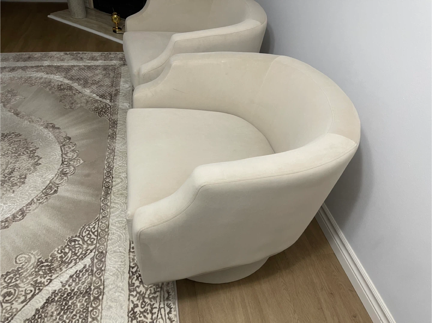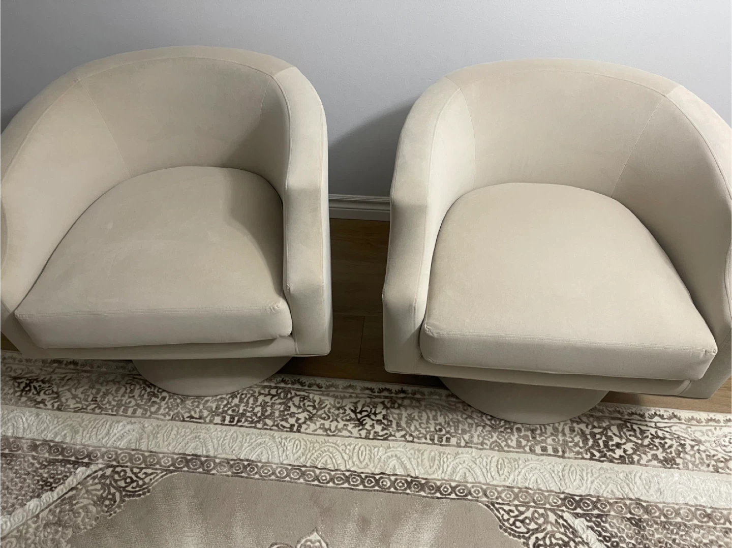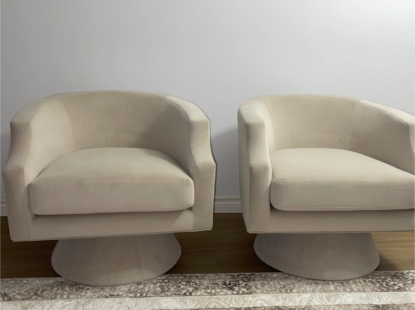 Selling a pair of swivel barrel accent chairs. They are a neutral beige and would look great in any living room or bedroom! There is a small scratch on one of the chairs.