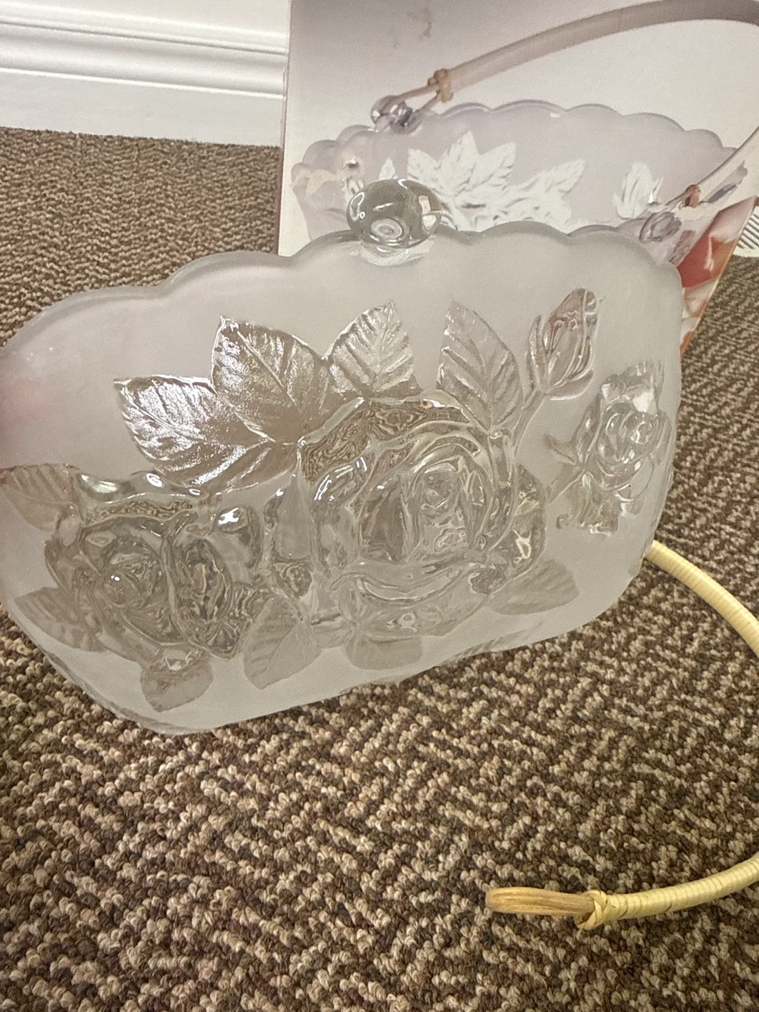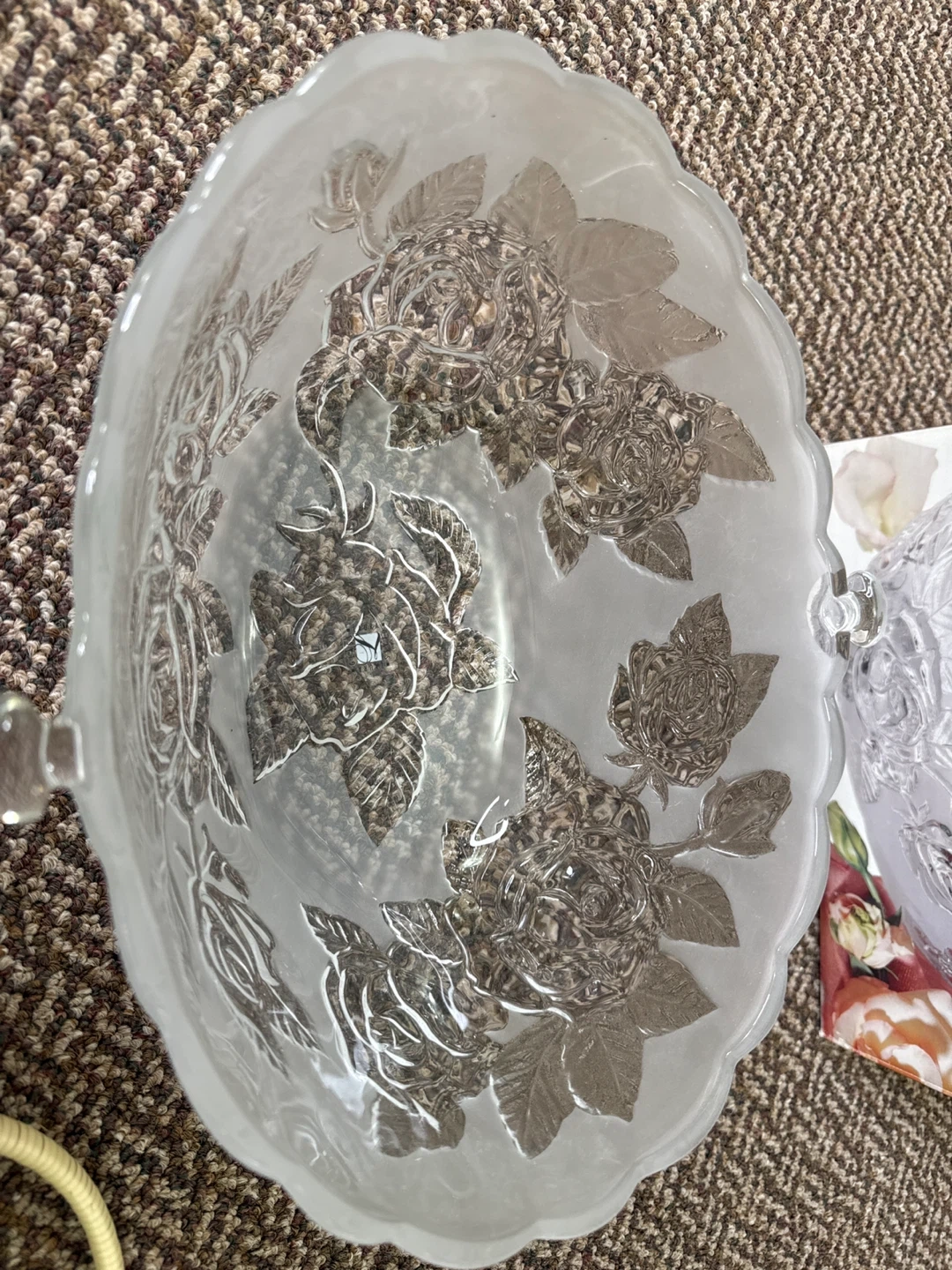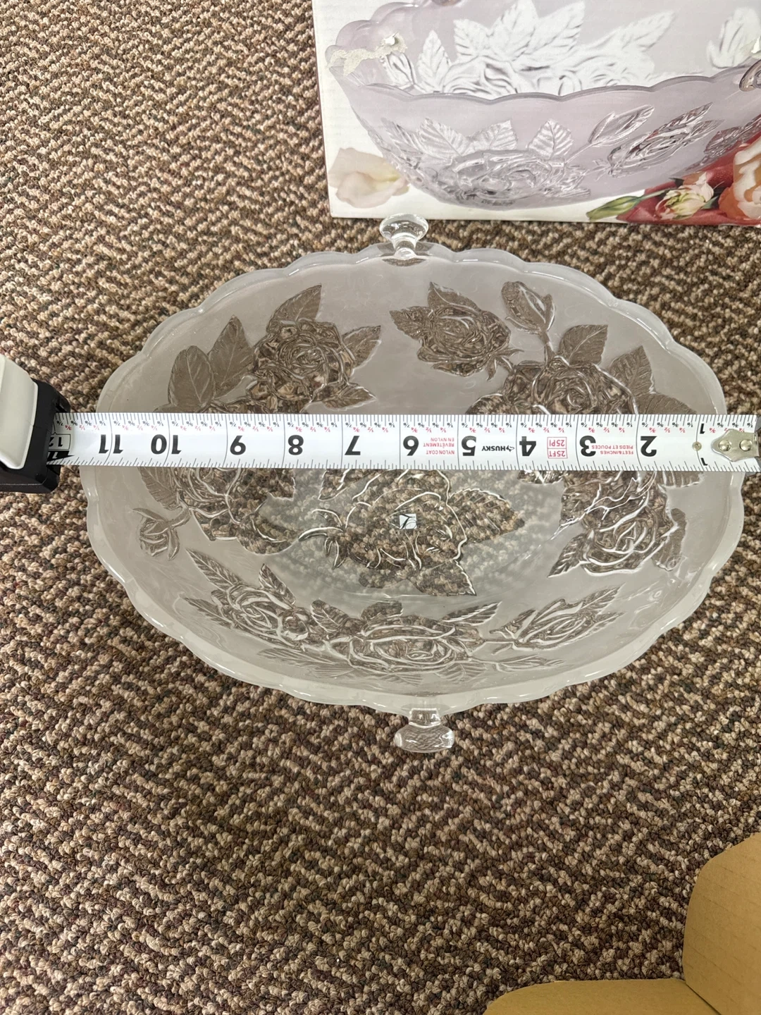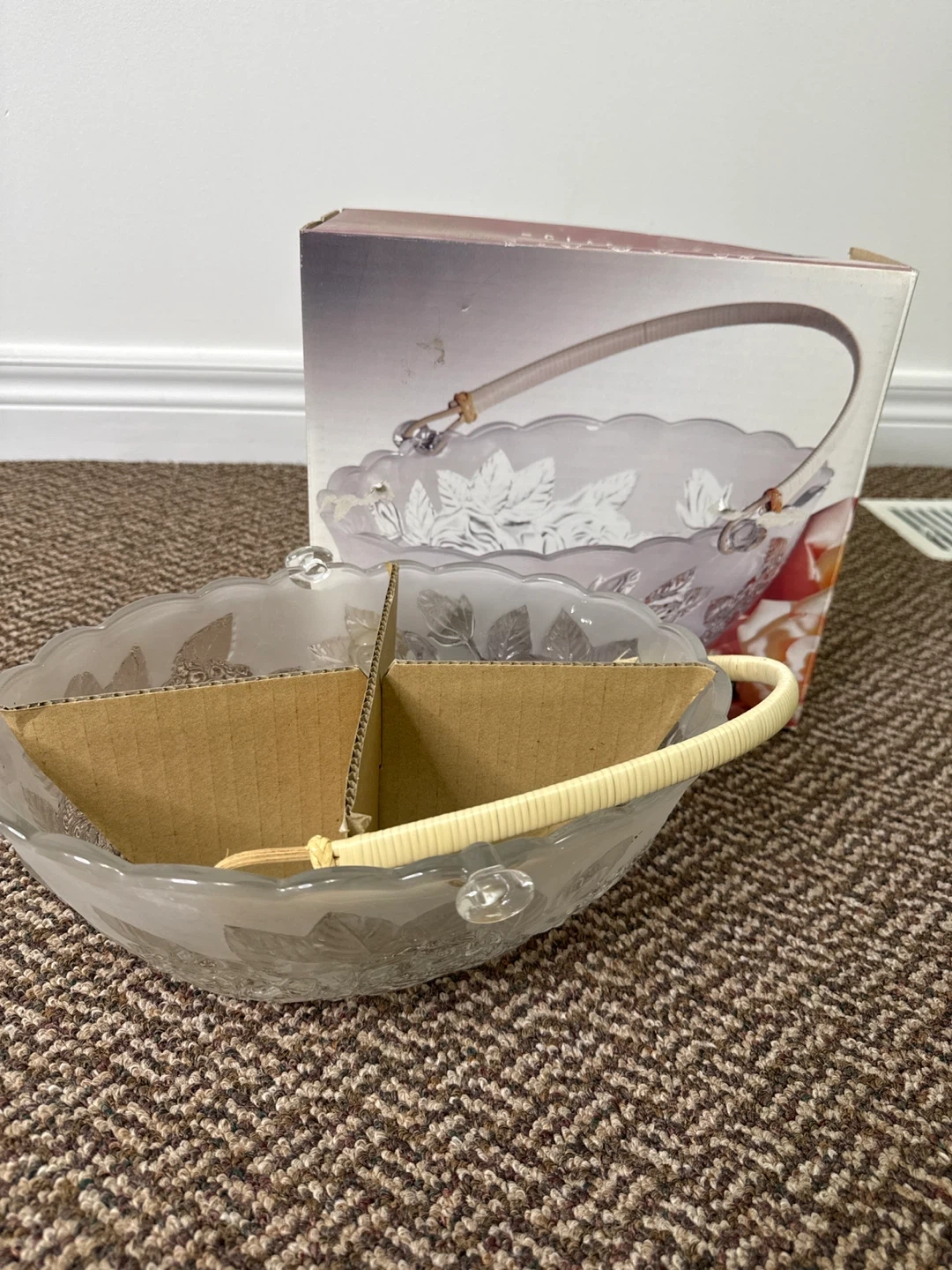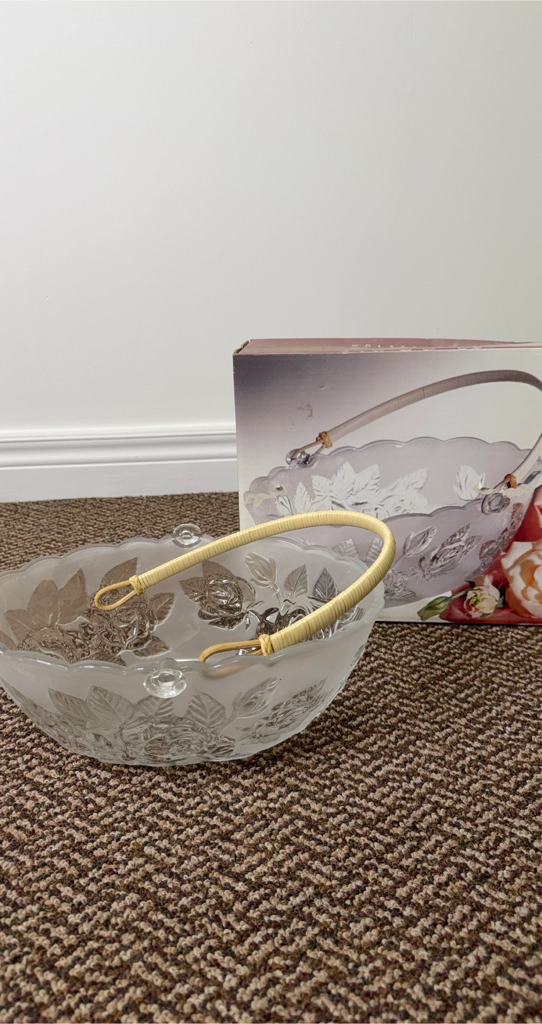 Here's a lovely frosted glass serving bowl, perfect for adding a touch of elegance to your table! It features a beautiful floral design and a convenient handle for easy carrying. The bowl measures approximately 11 inches across. It also comes with its original box!
