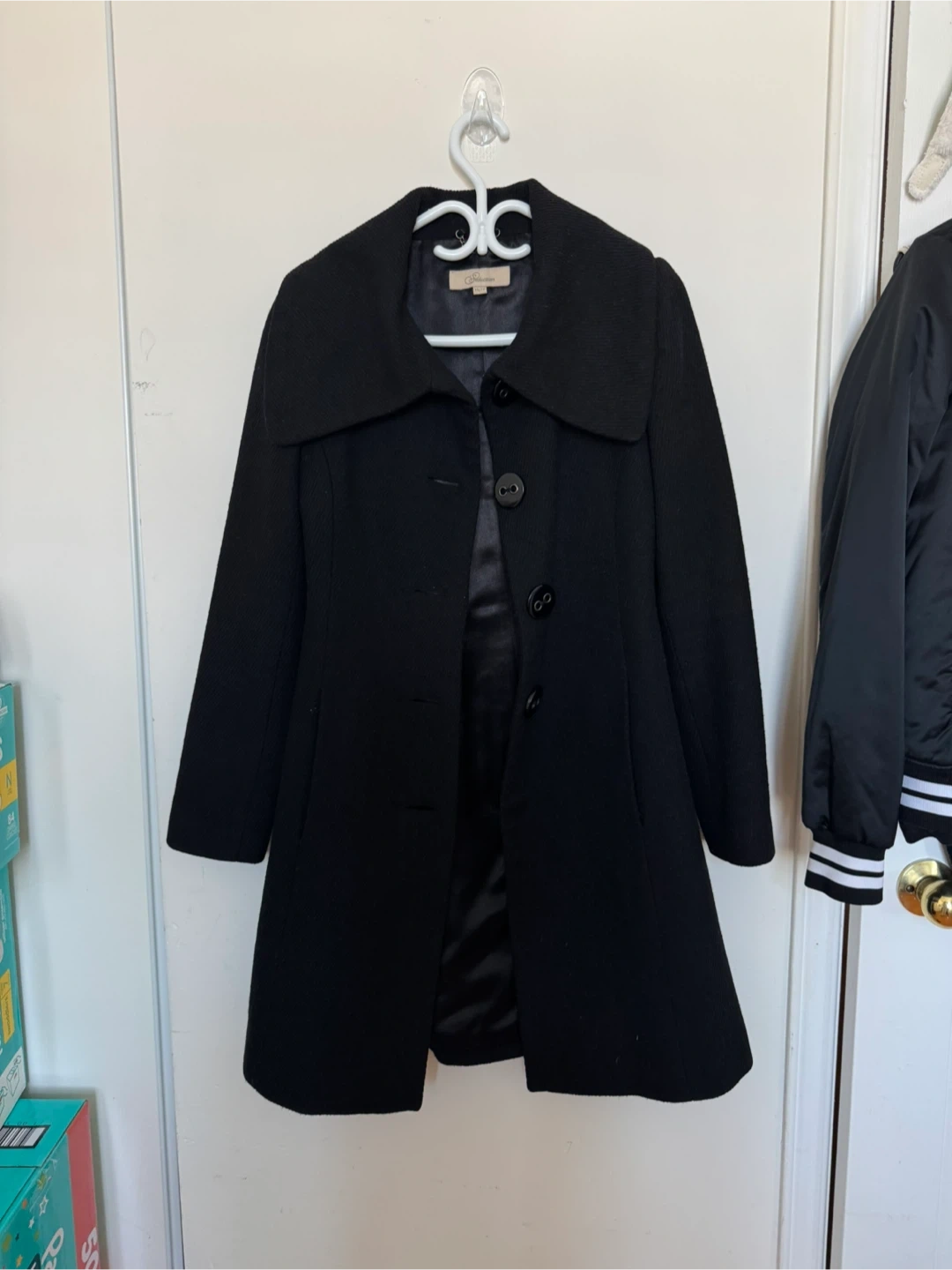 Elegant black coat with a structured fit and wide collar. Fully lined and in good condition.