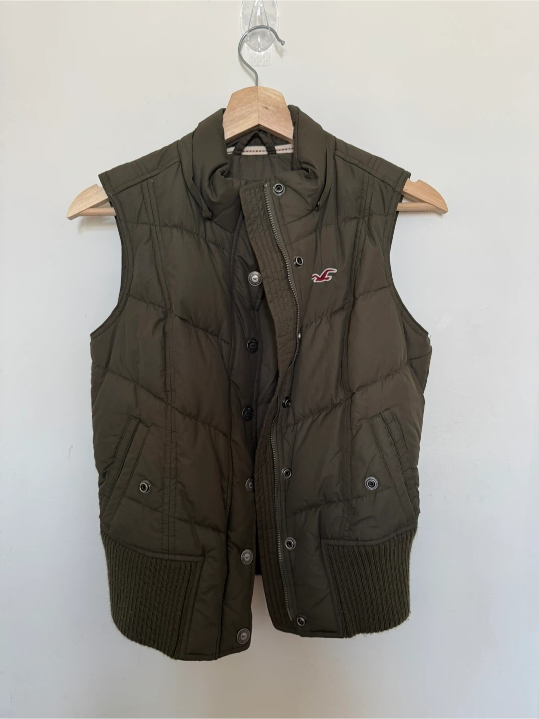 Selling a Hollister puffer vest in olive green. It's a size medium and in great condition! Perfect for layering during the cooler months. Can be fit to Xs-Small