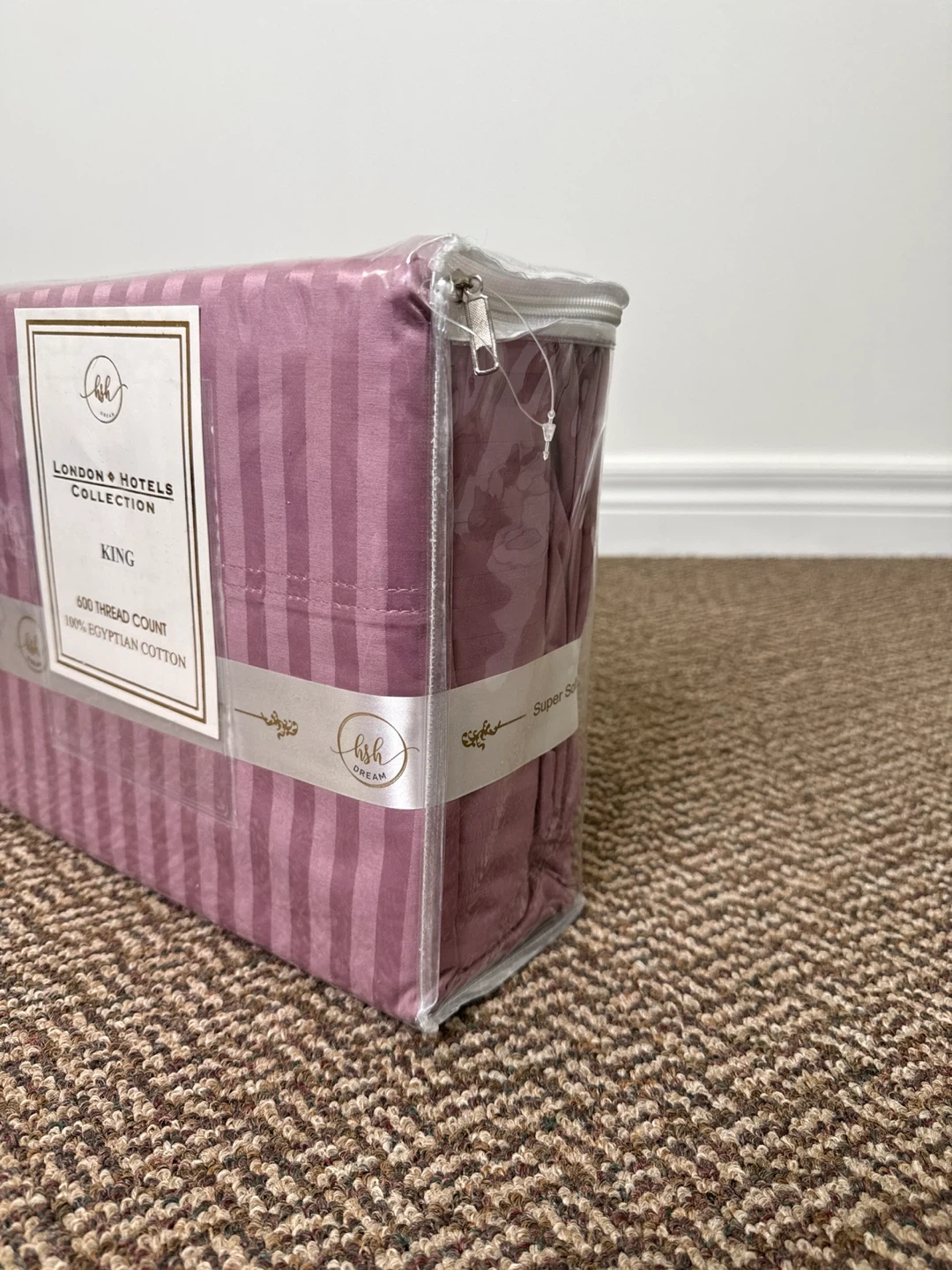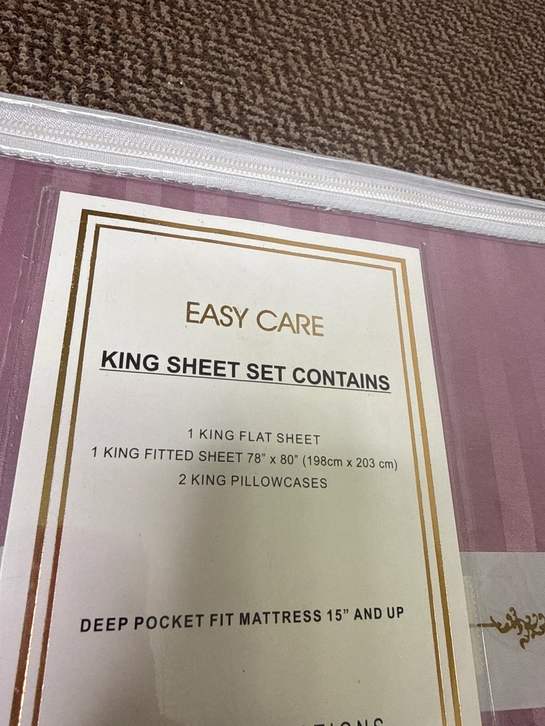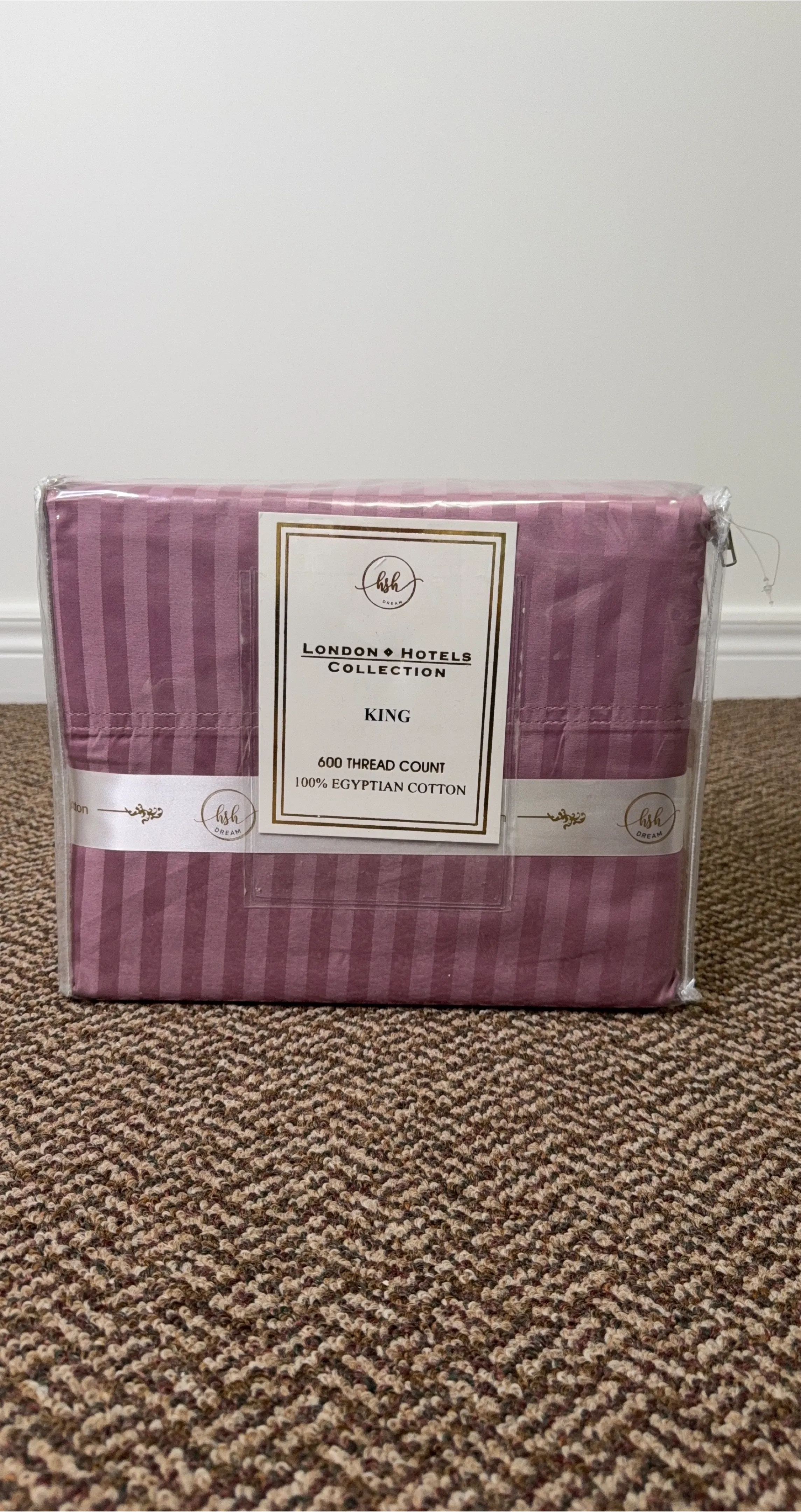 Selling a brand new London & Hotels Collection King sheet set! It's still in its original packaging. The set includes one king flat sheet, one king fitted sheet (78" x 80" / 198cm x 203 cm), and two king pillowcases. It's made of 100% Egyptian cotton with a 600 thread count. The fitted sheet has a deep pocket to fit mattresses 15" and up
