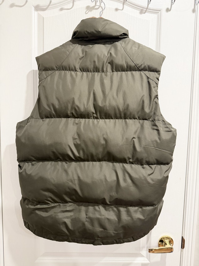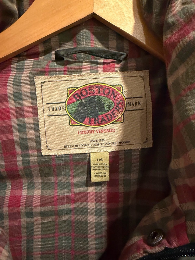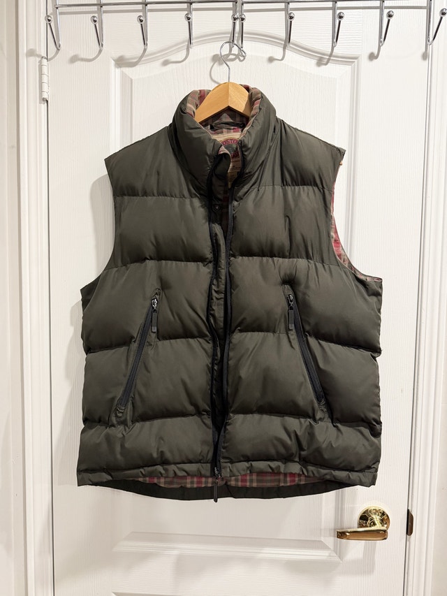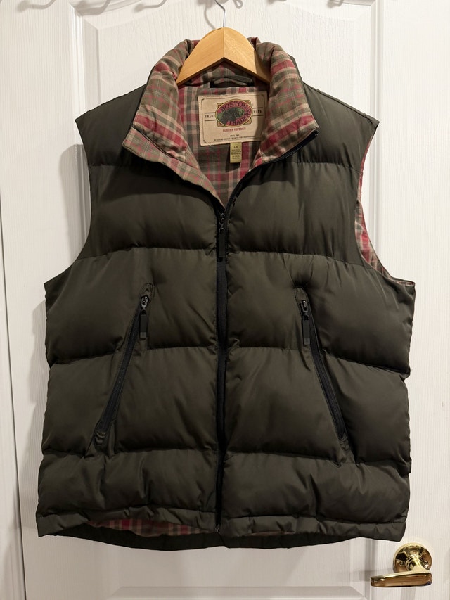 Boston Trader vest. This vest is an olive green colour on the outside with a red and green plaid lining. It has a full zipper, two zippered pockets on the outside, and one pocket on the inside.