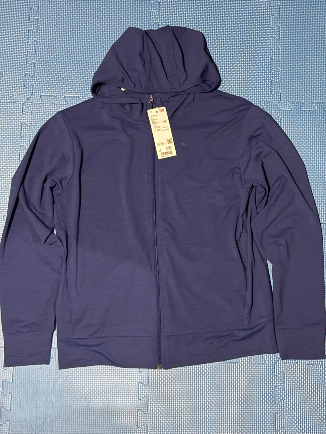 I'm selling a Uniqlo Airism full-zip hoodie in navy blue. It's in great condition and perfect for layering or wearing on its own. The Airism material is lightweight and breathable, making it super comfy for workouts or just running errands