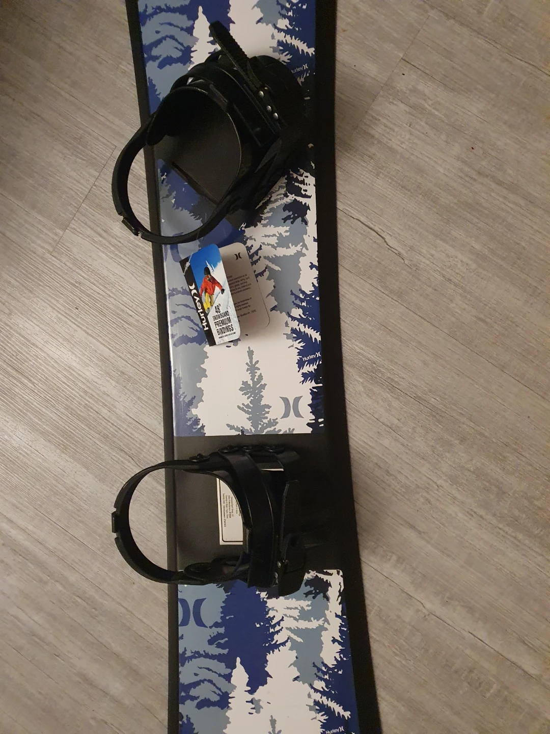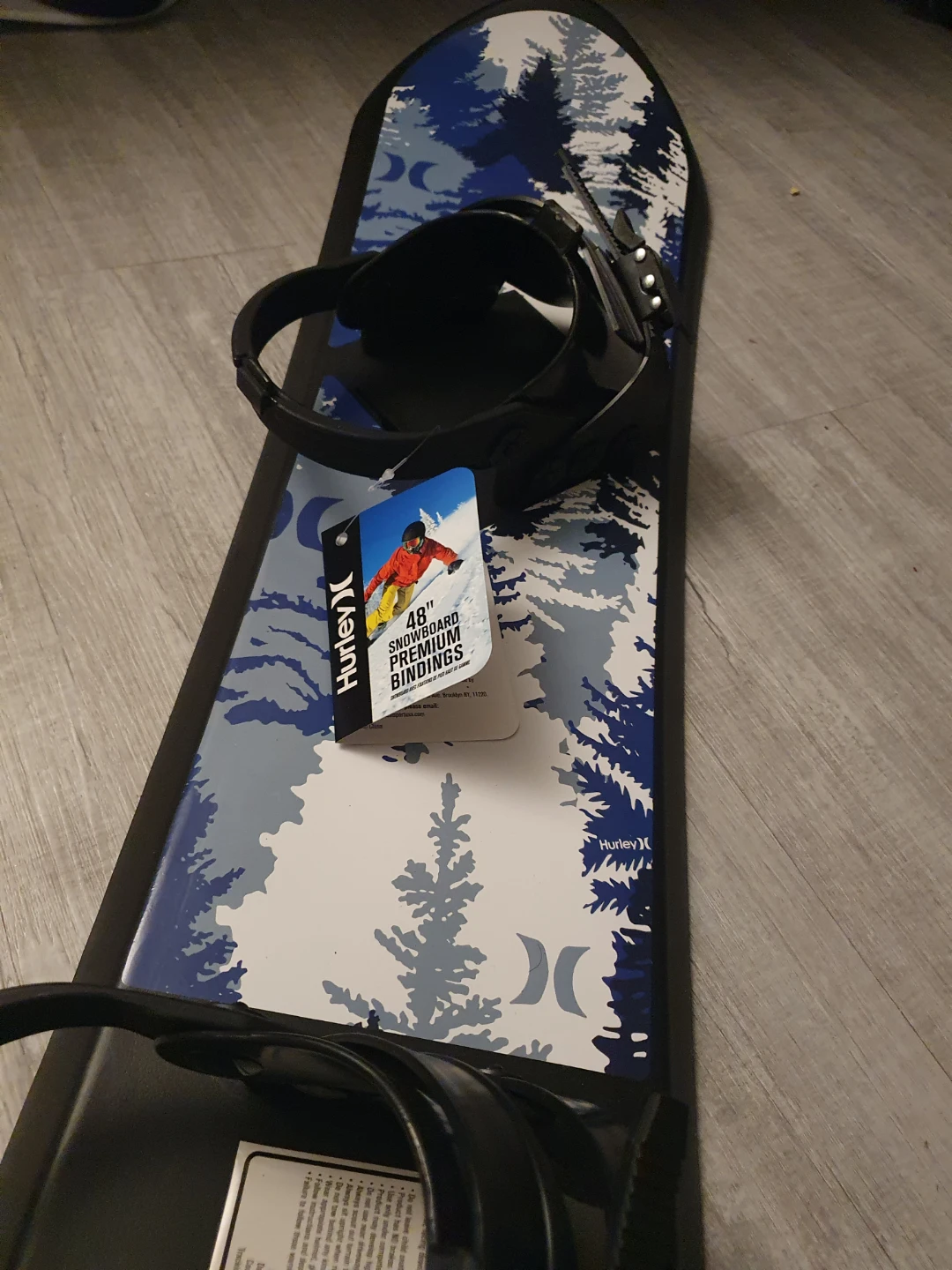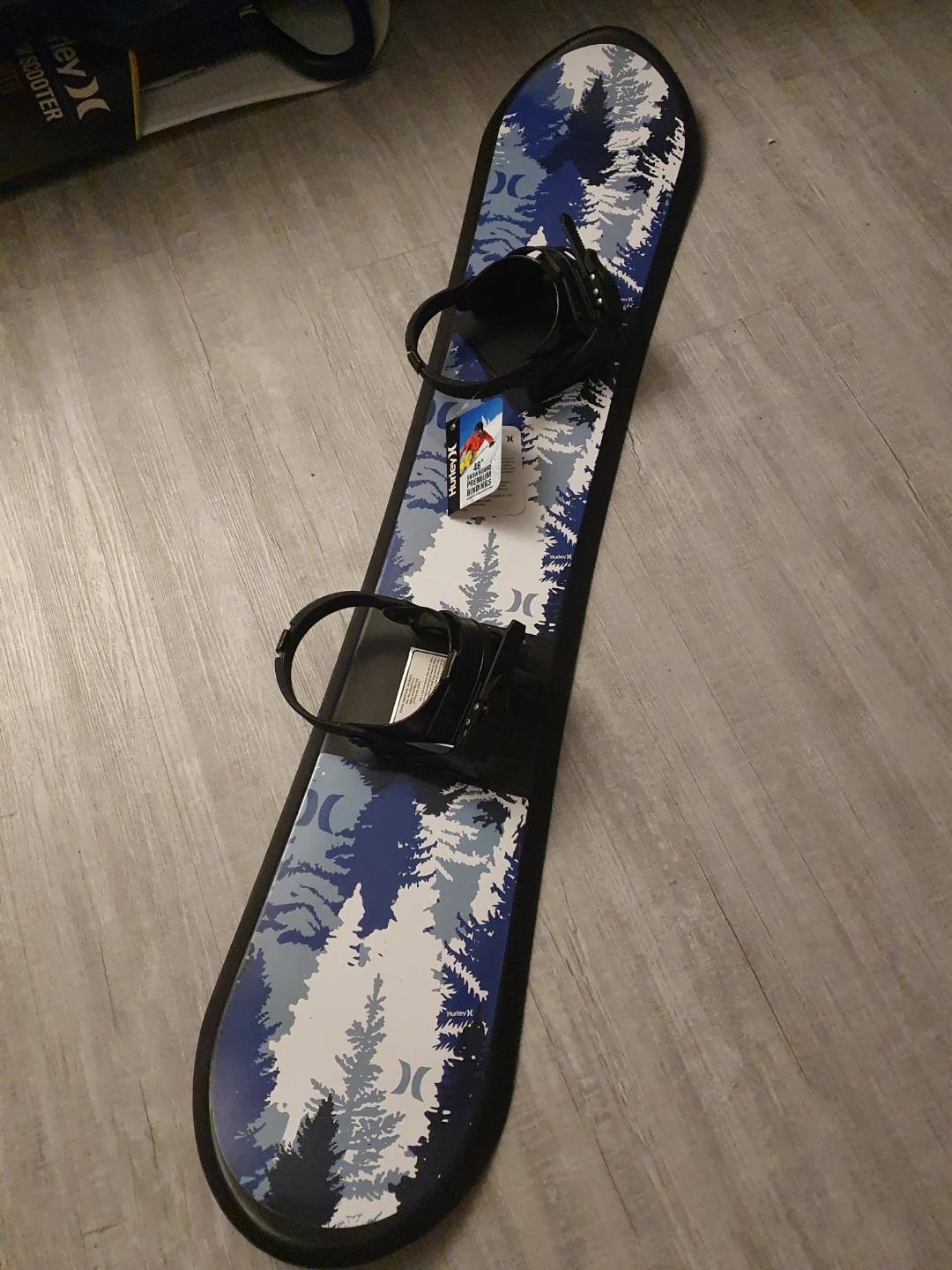 Selling a brand new Hurley 48" snowboard with premium bindings! This snowboard is ready for the slopes and features a cool blue and white tree design. The bindings are already attached, making it super convenient for your next snow adventure